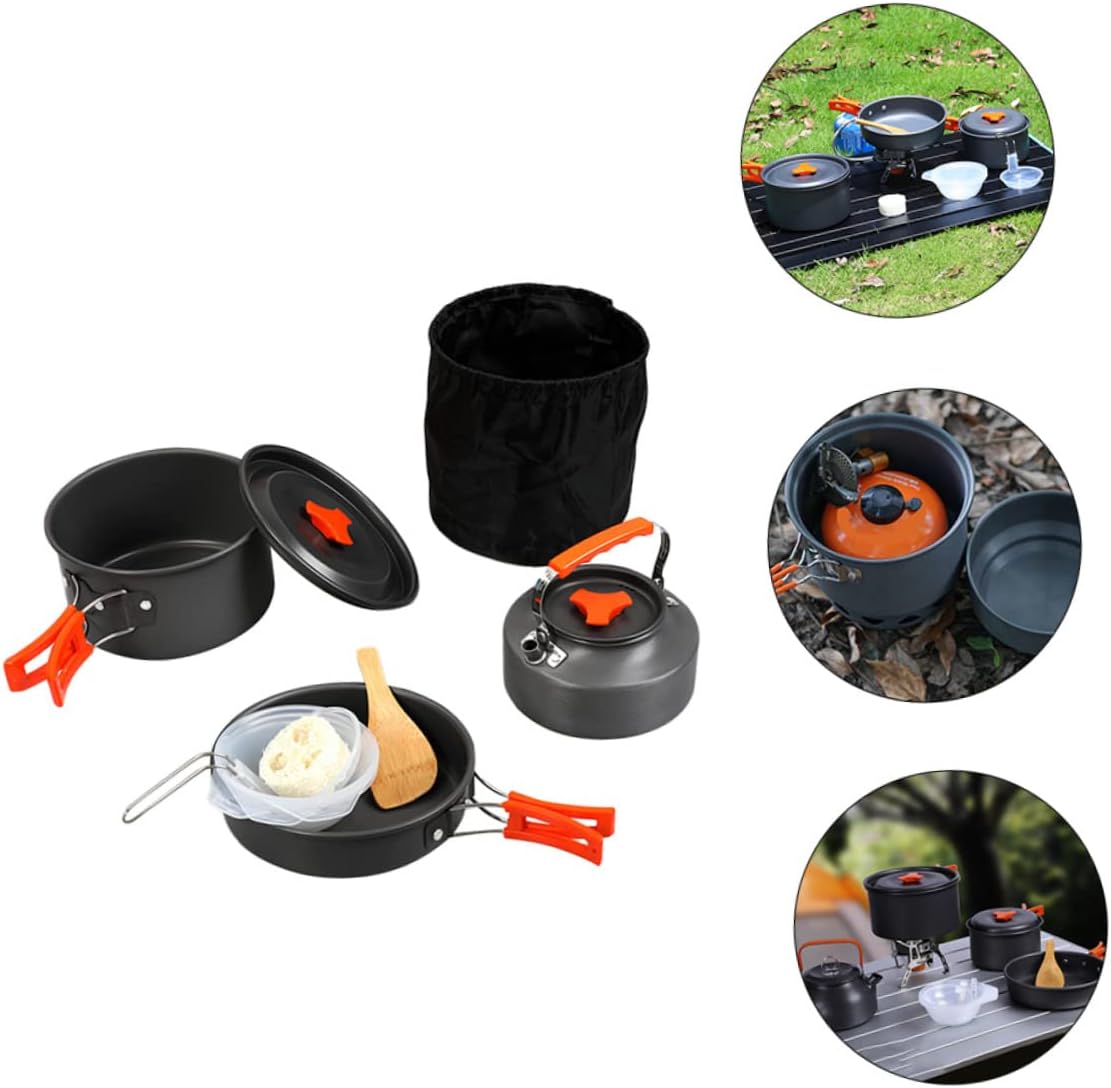 Package Include 1 x Kettle 1 x Frying Pan 1 x Cooking Pan 3 x Plastic Bowls 1 x Spoon 1 x Shovel 1 x Loofah Cleaner 1 x Storage Bag Characteristics -Product Info:Portable pot set - Material: Aluminum, Plastic portable camping cookware - Size: About 17.00X17.00X9.00cm/6.68X6.68X3.54inch camping pots - Color: Orange outdoor camping hiking picnic pot - This awesome cookware kit is designed for anyone who loves outdoor camping with families and friends! picnic cooking pan - The handle of the pot and the pan is convenient to hold and not hot. It is very easy to use camping kitchen accessories. - Made of premium aluminum and plastic material, tough, hard, it is very durable and wear resistant. camping hot water kettle - It is super-portable, making it much more convenient for camping, hiking, backpacking, picnic and other outdoor activities! camping utensil - Small size and portable, they can be stored together in a storage bag for convenient carry camp kettle.Goods Informationcamping cook pot want to have some camping cookware? Then, our camping cookware is carefully prepared for you.camping griddle pan A complete and durable cookware for camping, hiking, backpacking, picnic, day trips, family parties, lightweight and portable