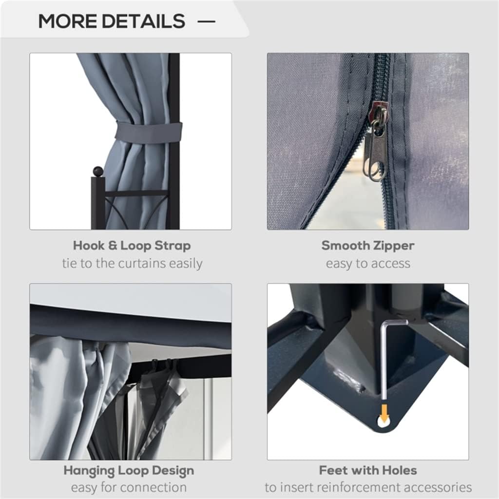 - CANOPY ROOF: The double-tiered polyester canopy tent has a PA coating that is sun protection, which provides shade on sunny days. With a small vented roof for heat and wind reduction- STEEL FRAME: This gazebo for patio is crafted from a selected steel frame for sturdiness and strength. 8 ground nails should be inserted into the feet and deep into the soil to increase stability- PRACTICAL SIDEWALLS: The removable polyester curtains can give you a private space to enjoy your leisure time. Hook and loop design to fix curtains onto the column easily- WIDE USAGE: Tall and large, this outdoor gazebo is roomy enough for you and other guests to gather inside without feeling overcrowded. This sun shade is suitable for backyard, patio, lawn, poolside, and more outdoor areas- GAZEBO FOR PATIO DETAILS: Overall Dimension: 13' L x 9.7' W x 8.9' H, Eaves Height: 6.2'. Assembly required. NOTE: Not recommended for use in extreme weather conditions such as storms or heavy winds/rain- Assembly requiredSpecification:- Color: Grey/Beige- Material: Steel, Polyester- Overall Dimension: 13' L x 9.7' W x 8.9' H- Eaves Height: 6.2'- Column Spacing: 12.1' L x 8.5' W- NOTE: Not recommended for use in extreme weather conditions- 1 x gazebo- 8 x ground stakes- 1 x manualNote:Due to different monitors and lighting effects, the actual colour of the product may differ slightly from the colour shown in the pictures. Thank you!Please allow 1-2 cm deviation due to manual measurement.The side wall of the net blocks unwanted guests with wings, and the side curtains can prevent wet environment.