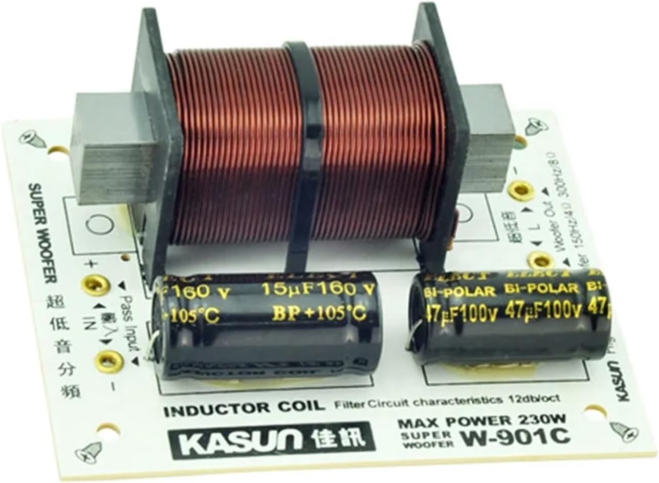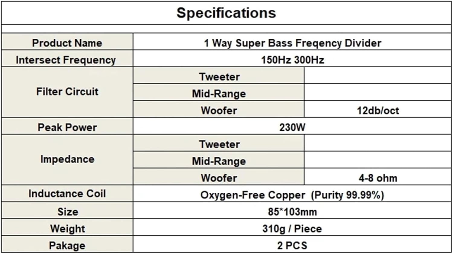 Frequency DividersSpecificationsProduct Name: 1 Way Super Bass Frequency DividerIntersect Frequency: 150Hz/4ohm 300Hz/8ohm Filter Circiut: Bass(12db / oct) Impedance: 4-8 ohmPeak Power: 230WSize: 85 * 103mmWeight:310g/PiecePackage Included:1 Piece Frequency Divider