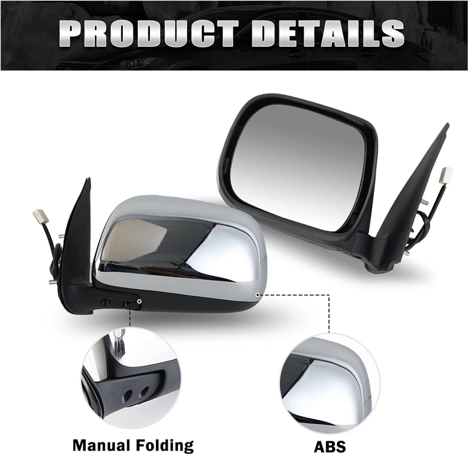 3 Pins Reraview Mirror Assembly Compatible For Toyota for Hilux for Vigo 2005 2006 2017 2018-2015 Chrome Manual Folding Side Car AccessoriesMaterial Highlights:Crafted from shock-resistant and corrosion-resistant material with firm structural integration, this side mirror assembly endures minor collisions and road gravel impacts, and adapts effectively to outdoor temperature fluctuations and moisture, retaining stable performance and appearance over prolonged use.Basic Function:This side mirror assembly provides clear rear and side viewing angles for drivers, supports safe lane changes, reversing and turning operations, and ensures stable signal transmission for power adjustment (if applicable) to maintain driving visibility.Core Features:The side mirror assembly boasts stable signal output, shock endurance and weather resistance. It aligns seamlessly with the door mounting position of compatible models, resists surface dust buildup, and allows easy maintenance with a soft cloth, blending with the vehicle’s exterior style.Installation:Easy to install: First confirm vehicle compatibility, then clean the door mounting interface and disconnect the wiring (if needed). Follow the attached guide to mount the assembly—no extra drilling or extensive vehicle modification required, preserving the door structure.