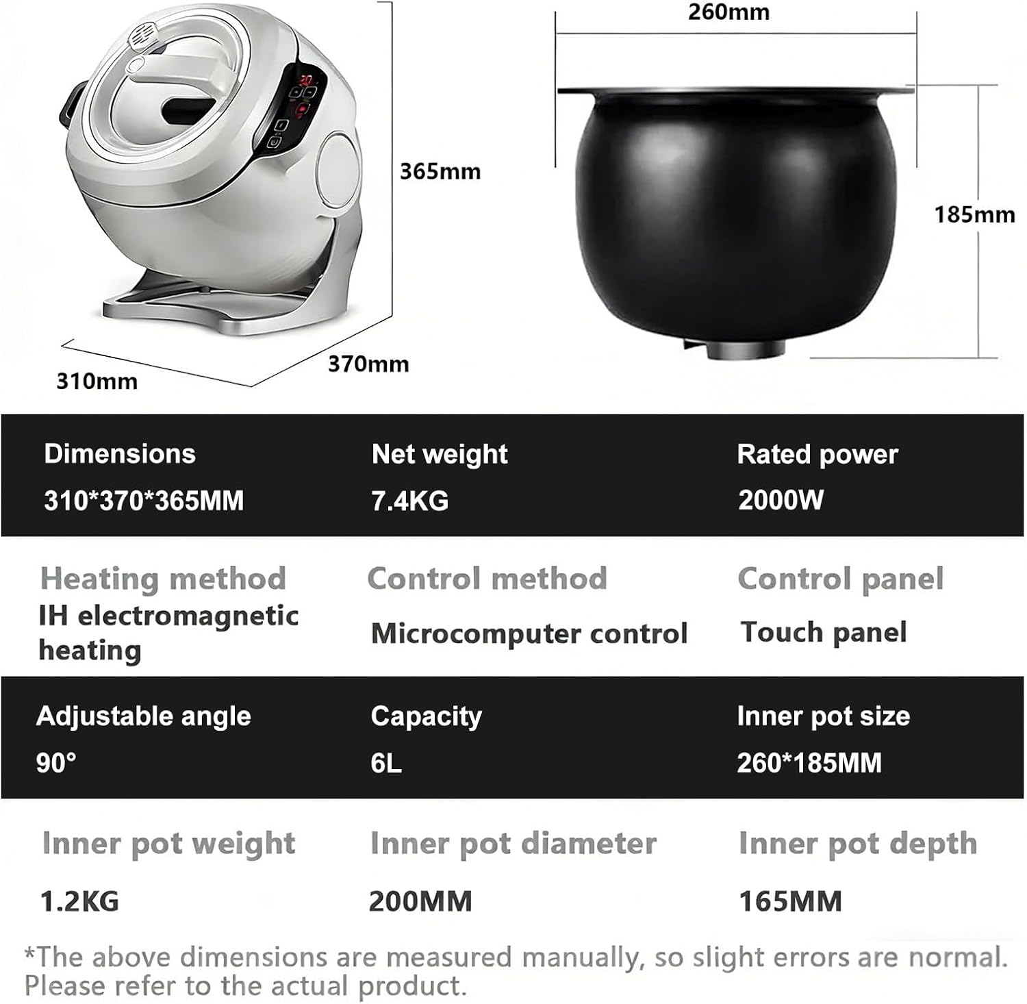 Revolutionize your cooking experience with the automatic 3D stir-fry cooker!Tired of spending hours in the kitchen? Discover the future of cooking – the smart all-in-one cooker that combines advanced 3D drum technology with intelligent touch controls to deliver perfectly cooked dishes at the touch of a button. Whether you're stir-frying, braising, or boiling, this versatile appliance brings professional performance right to your home.Key Features and Benefits:✅ 3D Rotating Drum and All-Around HeatingExperience even cooking with the 360° rotating drum and electromagnetic 3D heating. No more stirring, no more burning – just perfectly cooked dishes every time.✅ Smart Touchscreen Control PanelEasily adjust power, cooking time, and modes via the intuitive touchscreen display. One-touch start and preset programs make cooking a breeze, even for beginners.✅ Large 6-liter capacityIdeal for family meals, parties, or small restaurants. It can easily serve several people at once.✅ Non-stick coating & easy to cleanThe food-safe, non-stick inner pot prevents food residue buildup and ensures quick, hassle-free cleaning. The split design allows for easy removal and maintenance.✅ 3-level heat and pot settingsCustomize your cooking with three heat and pot settings to achieve optimal results with various recipes.✅ Safe & reliableThe temperature is kept below 260°C to prevent sticking and overheating.Specifications:Power: 2000 WPot capacity: 6 LHeating method: 3D electromagnetic heating (IH)Package contents:1 x Smart Cooking Machine1 x Serving spoon
