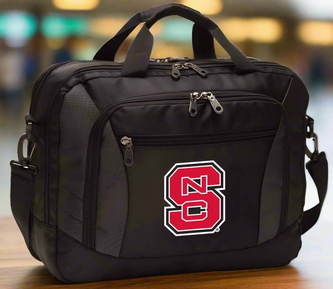 Perfect for travel or business, this is a serious NC State laptop bag that is loaded with useful features. This deluxe NC State laptop computer bag has multiple pockets for all your accessories. A reinforced, adjustable padded carrying strap can handle the weight of your laptop and more. A back strap allows this great NC State laptop bag to slide over the handle of rolling carryons for easy transport. Features super strong 1680 Denier Ballistic Fabric. Laptop sleeve compartment fits most 15in laptops. Overall Dimensions: 13in h x 16.75in w x 5.5in Approx. 1198 cubic inches Official NC State Laptop Bags - Up to 12% Returned to Support NC State Programs!