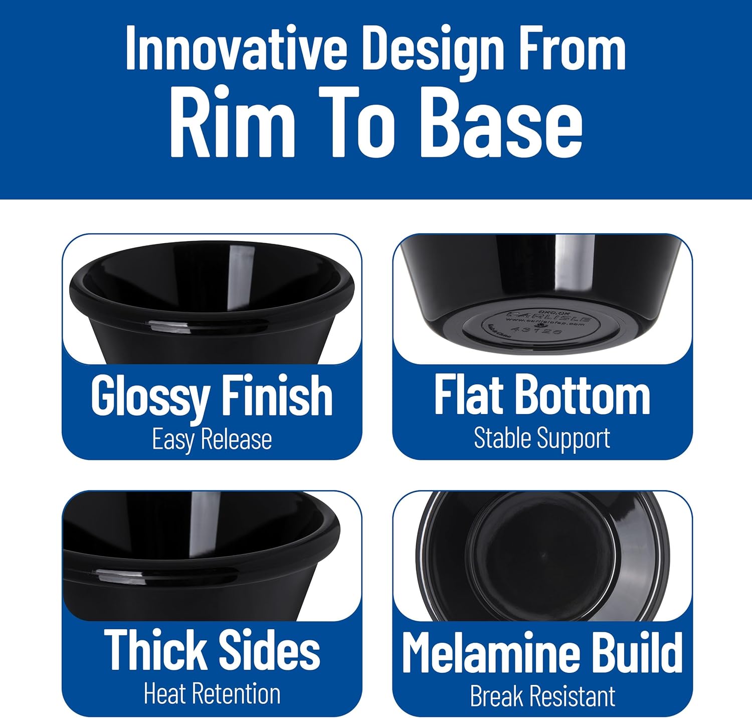 The Carlisle 4312603 SAN smooth ramekin is round, black-colored, and suitable for holding and serving butter, salsa, a sauce, a salad dressing, or another food. The ramekin is made of SAN (styrene acrylonitrile resin) for durability and resistance to heat and is dishwasher-safe. The rim helps prevent drips and spills. Two or more ramekins can be stacked for storage. The ramekin measures 1.80"/4.57 cm high and 3.90"/9.91 cm in diameter at the top. It has a 6.00 oz./0.18 liter capacity. It is free of BPA (Bisphenol A) to address food safety concerns raised by the U.S. Food and Drug Administration (FDA) and other organizations. Carlisle manufactures food service equipment and supplies and sanitary maintenance tools and supplies for commercial, industrial, and institutional facilities. The company, founded in 1954, is headquartered in Oklahoma City, OK.