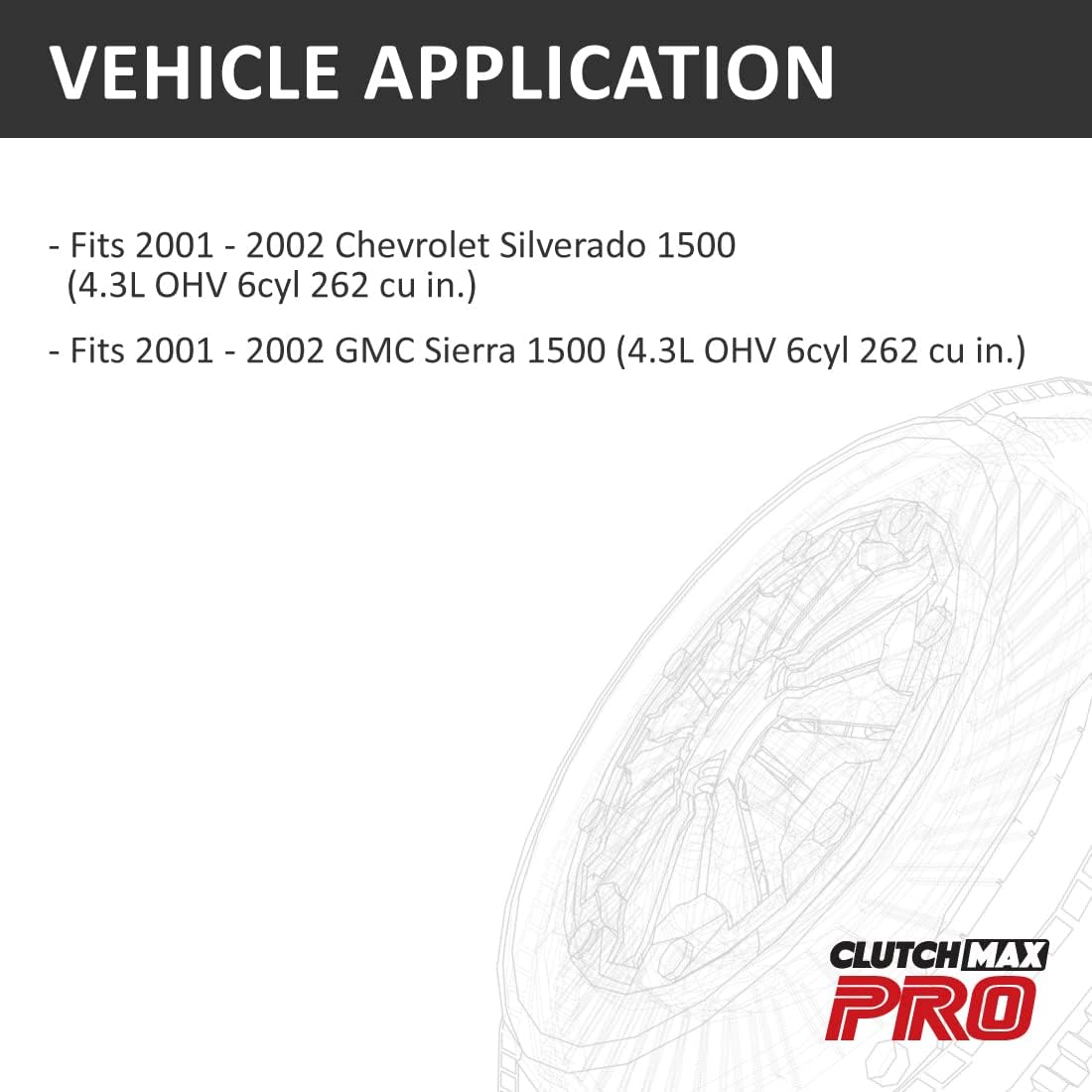 Vehicle Application Fits 2001 - 2002 Chevrolet Silverado 1500 (4.3L OHV 6cyl 262 cu in.)Fits 2001 - 2002 GMC Sierra 1500 (4.3L OHV 6cyl 262 cu in.) About ClutchMax PRO ClutchMax PRO® has 20+ years of history supplying very best clutch products to top tier clutch brands in Japan, UK, Australia and U.S. ClutchMax PRO® has taken this experience and a new approach to re-engineer performance clutch industry and is now one of the fastest growing performance clutch company in the world. ClutchMax PRO® contributes this growth to its commitment in the innovation and highest quality of the products that we design and manufacture, complimented by an industry leading warranty and unparalleled customer service. Compatible model and year list Please enter your Year, Make and Model above using Amazon’s ‘My Garage’ tool - the tool will specify which clutch kit fits your vehicle Questions or Concerns? If you have any questions/concerns, message us using Amazon’s ‘contact seller’ form. We respond to all messages within 24 hours.