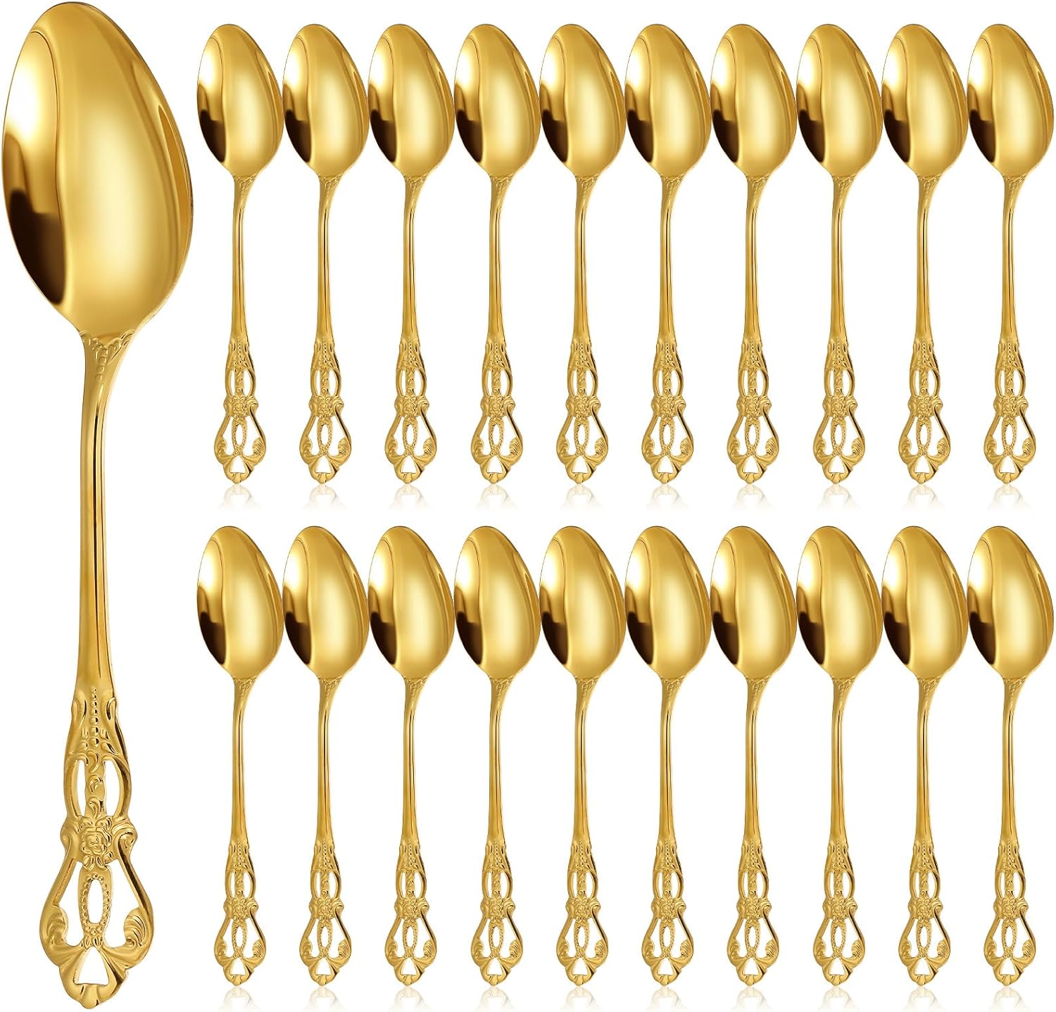 Features: Designed with an ergonomic handle, these gold teaspoons for tea offer a comfortable grip, making them a delight to hold during a leisurely breakfast or an elegant afternoon tea. Their thoughtful construction promises ease of use paired with timeless grace. The lustrous sheen of these gold coffee spoons is achieved through an impeccable mirror-polished finish. As dessert spoons or teaspoons for tea, they capture and reflect light beautifully, adding a luxurious touch to your table setting, whether for a simple tea break or an elegant gathering. Specifications: Material: stainless steel Color: gold Size: about 4.9 inches/ 12.5 cm in length Package includes: 50 x Teaspoons Notes: Manual measurement, please allow slight errors on size. The color may exist a slight difference due to different screen displays
