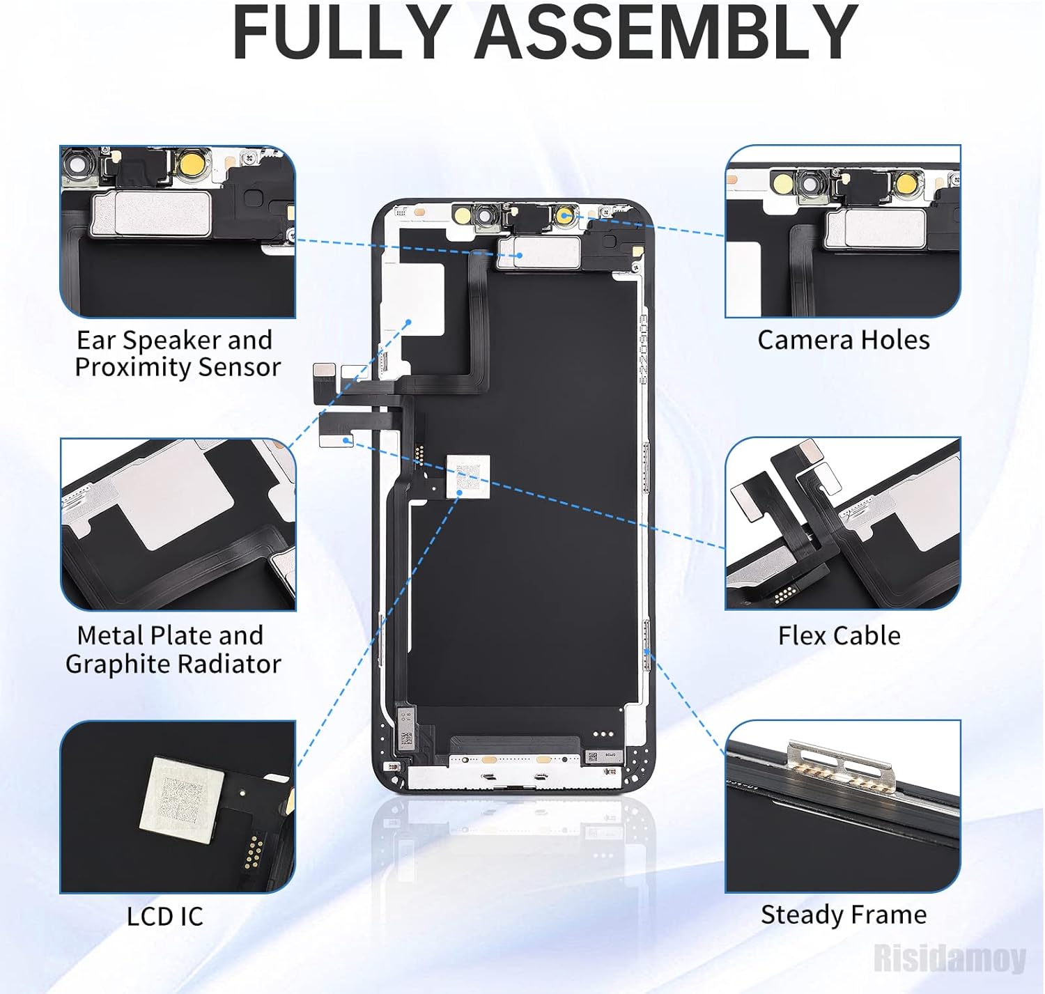 • 【Premium Quality】For iPhone11 promax LCD screen made of premium-quality materials, The IC chip is made of great-quality materials, flex cable is tough and not easy to break, and has strong stability. The back metal plate not only provides support and protection for the LCD screen, but also has graphite material on the surface, which has better heat dissipation function.