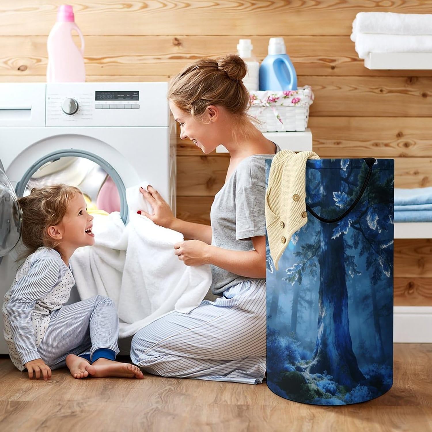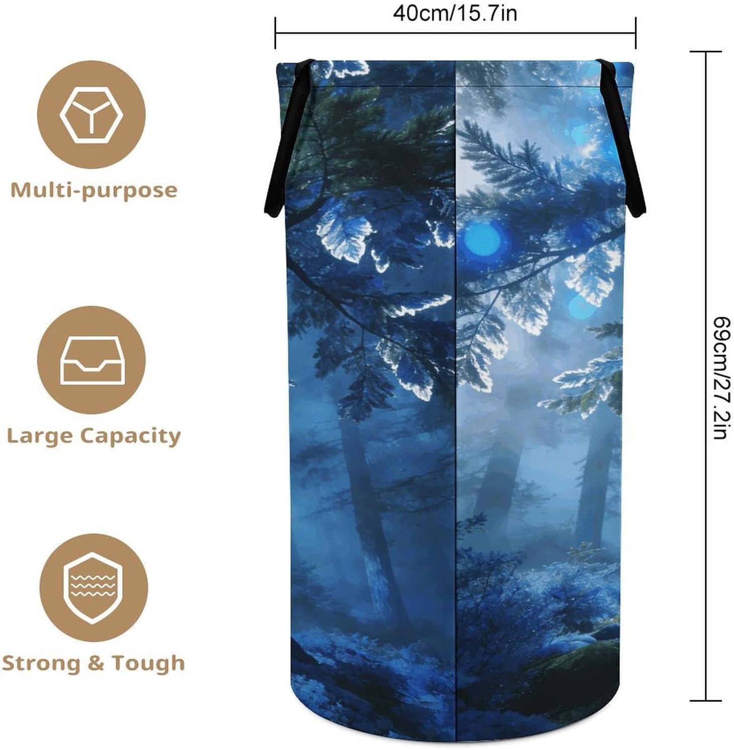 The pattern of the Forest Tree Blue hamper is printed with exquisite patterns, which makes the product more attractive.Chic design allows it to be used in the living room to hold throw blanket, pillows, and reading materials, as well as in the bathroom for towels, or as a laundry hamper.The laundry hamper adopted collapsible design, equipped with handles. It is lightweight and portable for using, storing, and moving conveniently.Forest Tree Blue Clothes hamper is suitable to store dirty clothes washing, place in the room to store toys, and other household goods, keep the house clean and tidy. Perfect laundry hamper for home, office, closet organizer, bedroom, bathroom, college dorm, etc.Gets out of your way when you need it to. This storage basket or laundry hamper is a good gift, which not only meets everyday storage needs but also carries deep care and love, a perfect way to turn thoughtfulness into warmth.