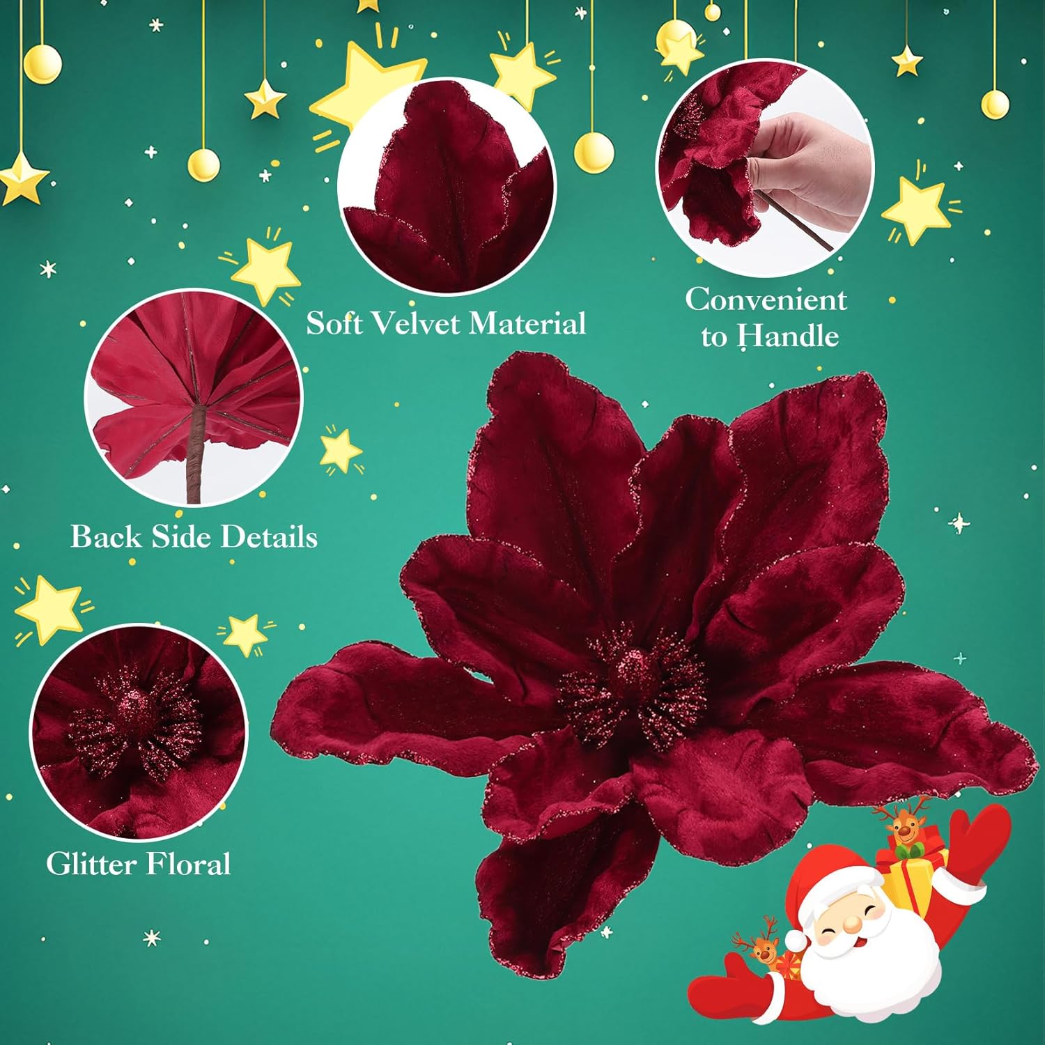 Ready to make your holiday decor unforgettable? Picture these large sparkling artificial Christmas poinsettias lighting up your tree or wreath—can you imagine the festive magic they'll bring to your home this season? Highlights at a Glance: - Eye-catching artificial Christmas poinsettias with sparkling edges and centers that shine under lights - Handcrafted velvet flowers and flexible wire stems create a lifelike, durable holiday accent - Petals easily fold for space-saving storage and unfold for a full, lush look every season - Simple to add to wreaths, garlands, Christmas tree decorations, or table centerpieces - Versatile holiday floral picks bring festive elegance and charm to any room or celebration Specification: Product Name: Artificial Christmas Flower Flower Diameter: 11.8 in Material: Velvet and Metal Color: Red / White Friendly Note: For best results, gently unfold each petal to achieve a full, natural look before decorating. Insert the flexible wire stem into your wreath, tree, or arrangement and adjust as needed. Store folded in a dry place when not in use to keep flowers looking fresh. Packing List: 12 x Christmas Flowers 1 x Assembly Instruction