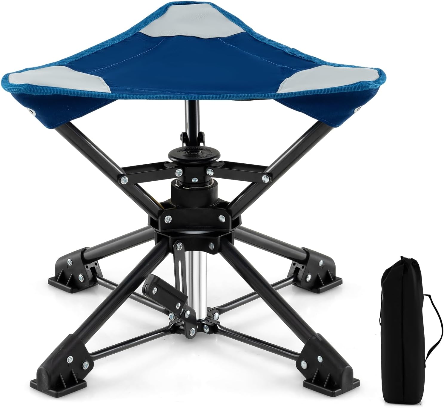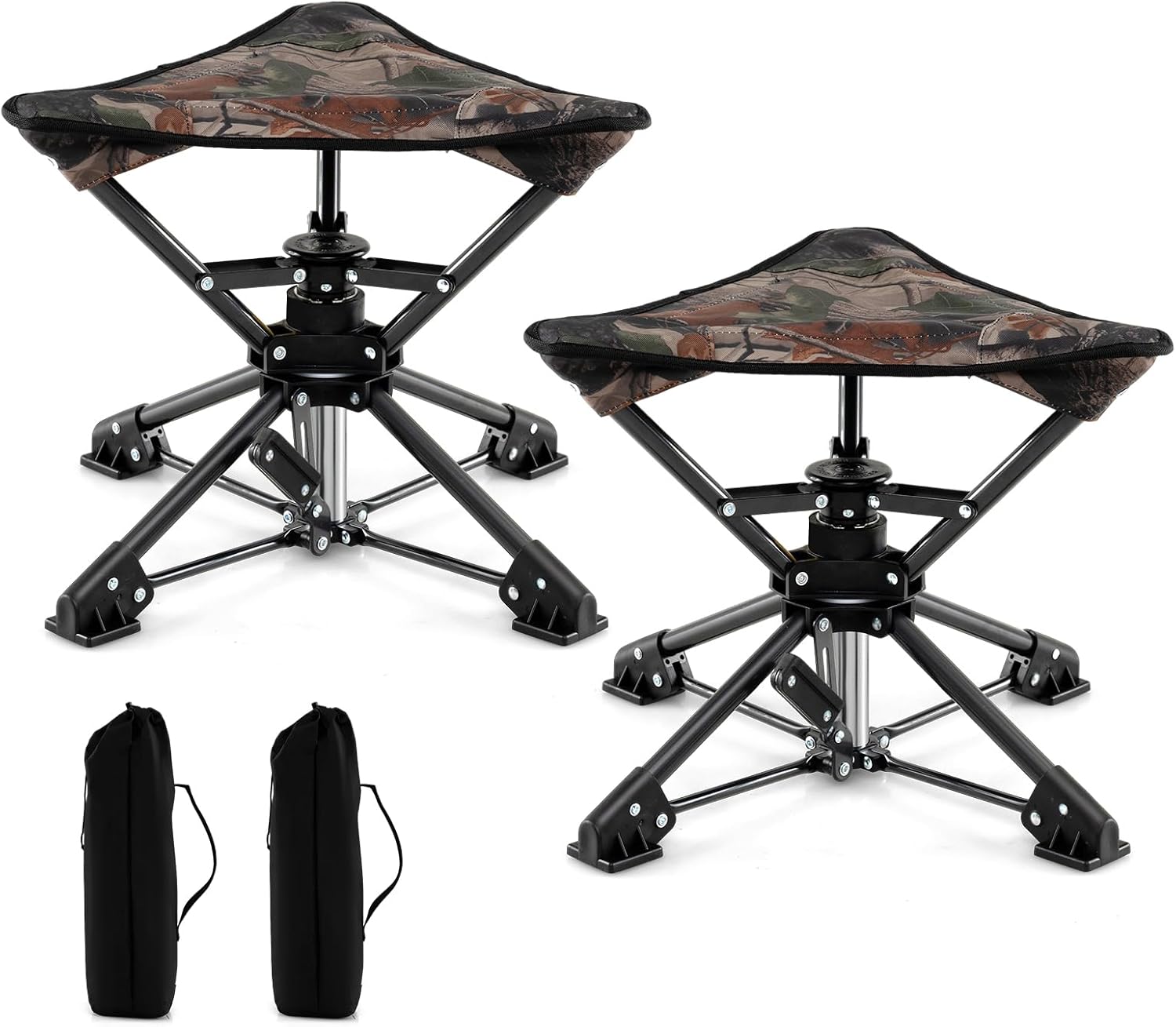 Description:Experience Comfort and Convenience Like Ever Before!Our folding tripod camping stools boasts a 360° flexible rotating base that ensures a smooth and quiet movement, allowing you to easily turn and adjust in any direction. It is built with a sturdy metal frame and reinforced with 4 wide stabilizing feet, ensuring a stable and reliable seating option on a variety of terrains. Plus, the 600D oxford seat is both waterproof and tough enough to withstand the rigors of the outdoors, ensuring long-lasting performance. Folding and unfolding the stool is a breeze, simply press or step down to collapse it, and slip it into the included carrying bag for easy transportation and storage. Ideal for camping, fishing, hunting, and attending outdoor events, this portable stool combines convenience, comfort, and versatility to meet the needs of adventurers and casual users alike.Features:360° rotation, turn around to take in different views at outdoor eventsMetal frame offers sturdy and reliable support, not easy to wobbleEquipped with anti-slip and anti-sink footpads, ensure good stability and balanceHigh-strength 600D oxford seat, not easy to wear or tear, built to lastEasy and effortless to set up and take down in seconds, no tools requiredEquipped with a compact and lightweight carrying bagIdeal for beaches, picnics, camping, fishing, hunting, hiking, backpacking, travels, etcSpecifications:Color: Camouflage/Blue+BlackMaterial: Metal, 600D Oxford ClothProduct Dimensions: 17" x 15.5" x 14.5" (L x W x H)Folding Size: 5.5" x 5.5" x 24" (L x W x H)Weight Capacity: 330 lbsNet Weight: 5.5 lbsPackage Includes:1/2 x Folding Camping Chair1/2 x Carrying Bag1 x User’s Manual