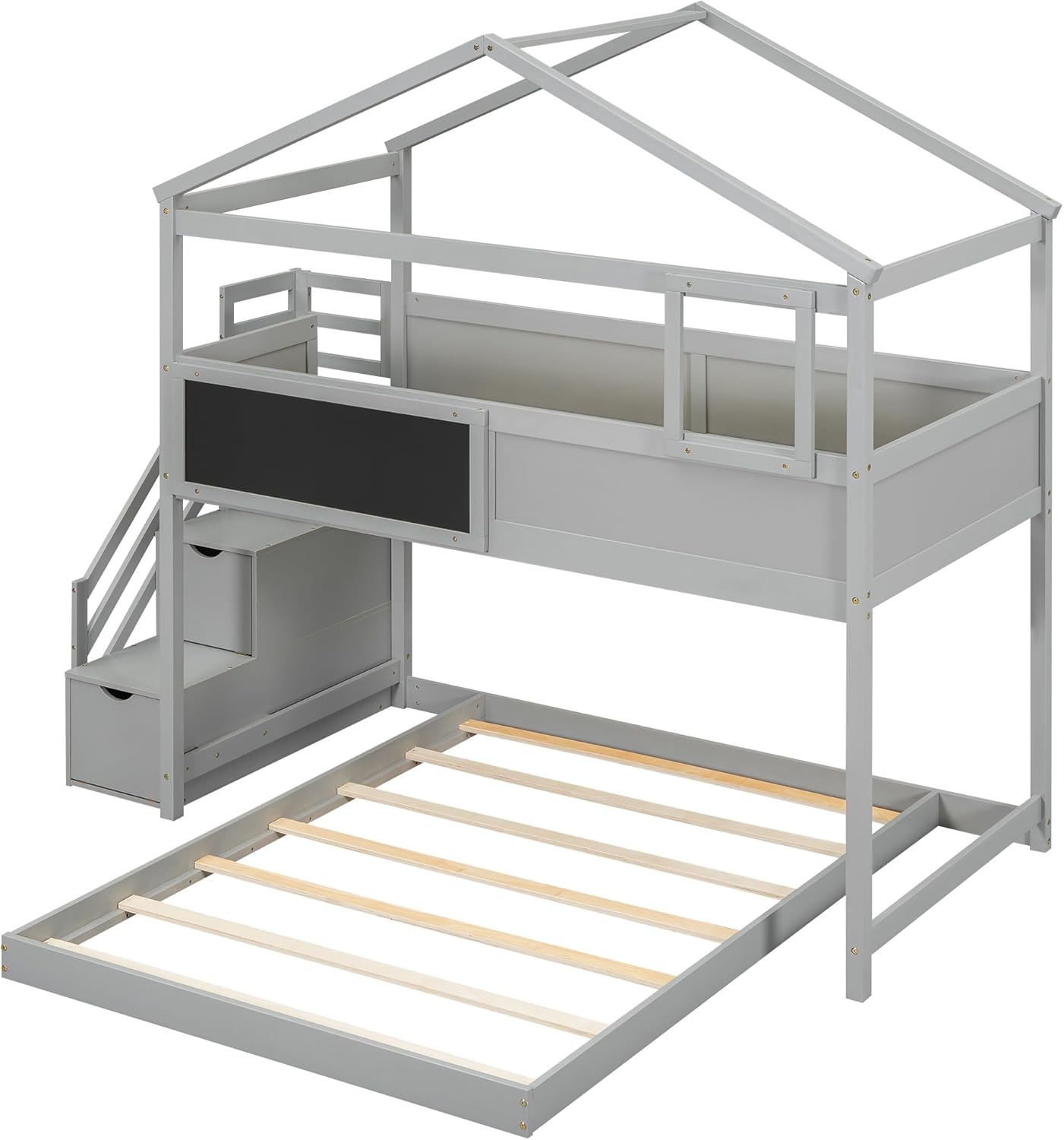 The house bed frame bunk bed for you features a classic house roof shape that will inspire your imagination, and you can decorate the blackboard and for the bed shape,you can pretend it’s a fortress, giving full play to imagination. Featuring a sturdy bed frame , this bunk bed is the spot you will want to do everything – from playing house with your friends to dreaming day or night. Description Bed Material: Pine Wood+MDF Size: Twin/Full Color: Gray Numbers of Package: 2 Assembly Required: Yes Origin: Vietnam Dimensions Overall Product Dimension: 94.4''L*77.4''W*86.9''H Upper Bed Dimension: 76''x38.2'' Down Bed Dimension: 76''x54.5'' Total Height: 86.9'' Number of Upper/Down Bed Slats: 14/7pcs Overall Product Weight: 199lb Upper/Down Bed Weight Capability: 300/350lb Recommend Upper/Down Bed Mattress Thickness: 6''/8-10''