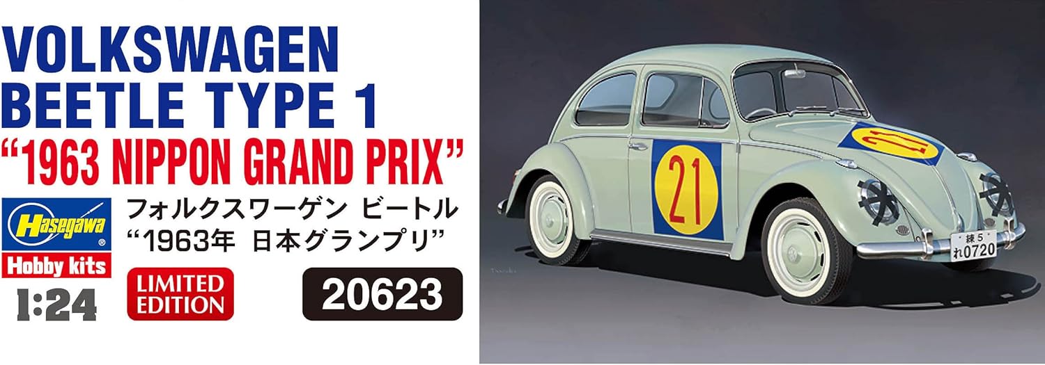 1/24 VW Beetle, 1963 Nippon Grand Prix Plastic model kit of a German car, here in the Rally version with 82 parts. Decals of the 1963 Nippon Grand Prix Suzuka Circuit May 3, 1963, No. 21/Giichi Suzuki, Nr23/Tatsuo Takeuchi or No. 28/Masashi Ichise. Length built 171 mm / width 64 mm.