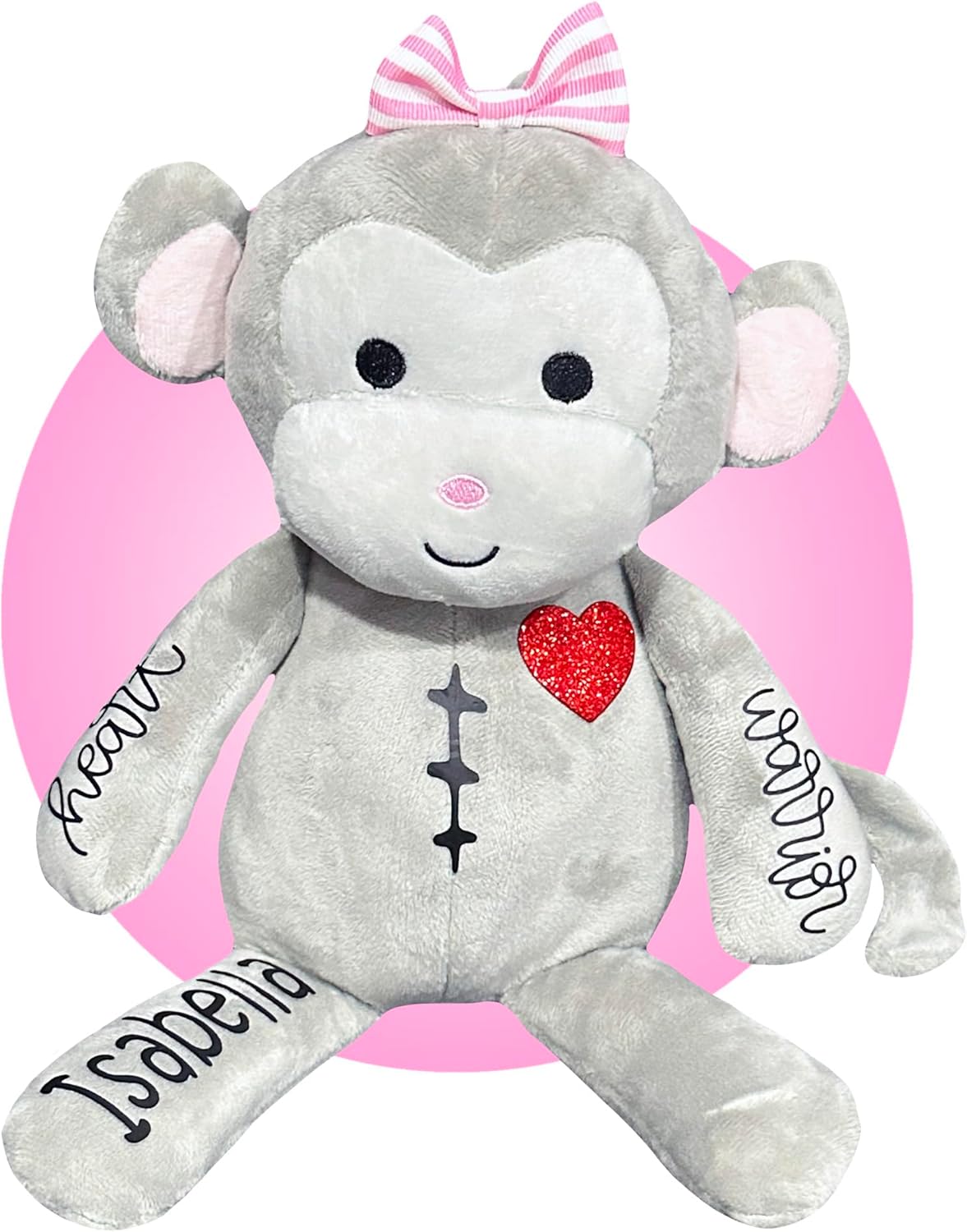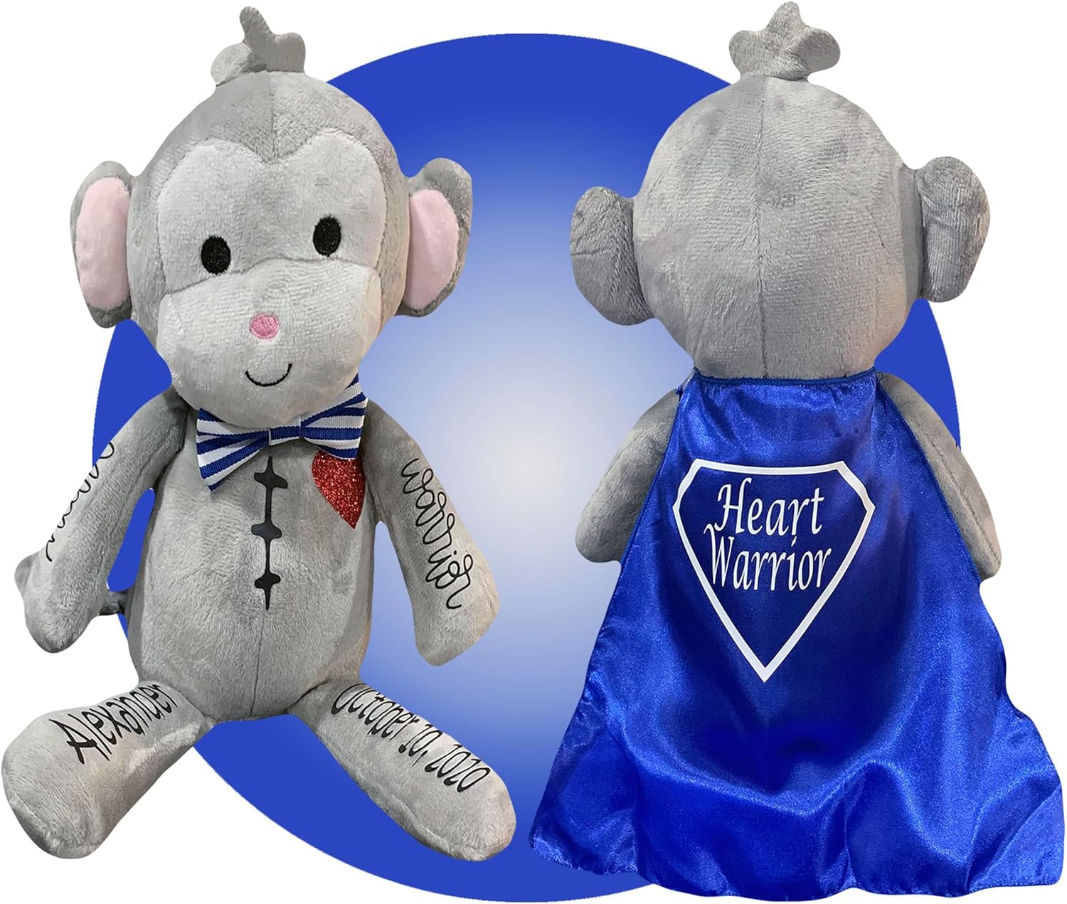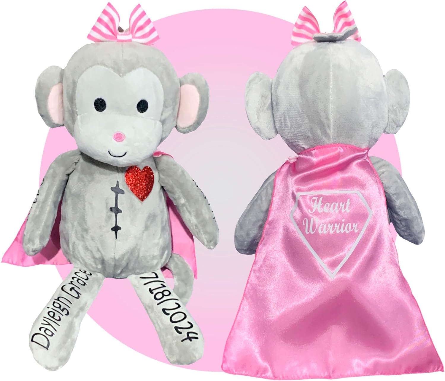 Give your child a comforting friend with Kikilishop's Scar Buddy Monkey, specially designed for children dealing with congenital heart disease (CHD). This adorable and super soft plush toy has accompanied hundreds of children through their heart surgeries, bringing smiles and comfort during challenging times.Features:Handmade Details: Choose from a handmade bow, bow tie, or no accessory.Heart Warrior Superhero Cape: Add a customizable superhero cape in your choice of color. Choose to have the bow or bow tie match the cape, adding a coordinated touch. The cape is easy to attach and remove with a snap clasp.High-Quality Materials: Crafted with high-quality heat transfer vinyl, ensuring a durable and adorable look.Personalized Options: We understand that every scar is unique. That's why we offer a variety of customization options to create the perfect Heart Warrior Monkey for your child.Why Choose Kikilishop?Each Heart Warrior Monkey is made with care and has brought joy to hundreds of children, making it one of our most popular items. The gratitude from recipients during their toughest times is a testament to the thoughtfulness and comfort our plushies provide.