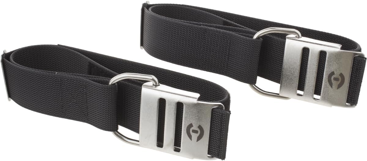 Hardware to support two side-mounted tanks on the SMS100 Harness (see SKU: HLSSMS). Top bolt snap is a safety clip, a redundant point of attachment in addition to the bungee which wraps around the tank valve. This clip connects to the shoulder D-ring on both the left and right side of SMS harness. The lower clip is secured using the cam band and tri-glides and connects to the appropriate rail on the butt-plate. Includes: (2) stainless steel cam bands, (2) stainless steel tri-glides, (4) 4.5" (11.4 cm) stainless steel bolt snaps, nylon line to secure bolt snap to tank, and bungee. Stainless Steel Cam Band Assemblies are constructed from 2" (5 cm) wide durable nylon webbing with a box stitched stainless steel cam buckle for extra strength. The bolt snaps have spring loaded gates for easy operation and positive retention. Snaps are equipped with 360° degree swivels.