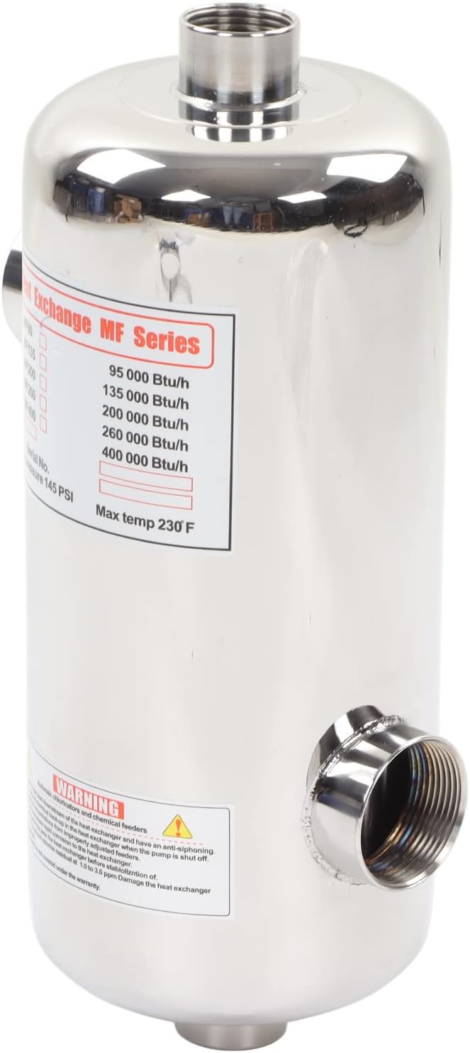 Specification:Item Type: Pool Heat ExchangerMaterial: Stainless SteelWeight: Approx. 2837g/100.07ozSize: 34.2x15.7cm/13.46x6.18inSpecifications: 40KWNote: Does not contain electricitySide Thread: Female Thread 45mm/1.77inFront and Rear Thread: Female Thread 32mm/1.26inMaximum Operating Temperature: 230℉ (110℃)Purpose: Suitable for all types of swimming pools, spas and hot pools and spasType of Heat Exchanger: MF 135Application Scenario: swimming pool, hot spring, hot tubSwimming Pool Area: 12000 Gallon, Temperature required to rise 1 ℉/h: 100098 btu/h; Temperature required to rise 2 ℉/h: 100098Swimming Pool Area: 14000 Gallon, Temperature required to rise 1 ℉/h: 116781 btu/h; Temperature required to rise 2 ℉/h: 133464Swimming Pool Area: 16000 Gallon, Temperature required to rise 1 ℉/h: 133464 btu/hPackage List:4 x Part1 x Heat Exchanger1 x Instruction