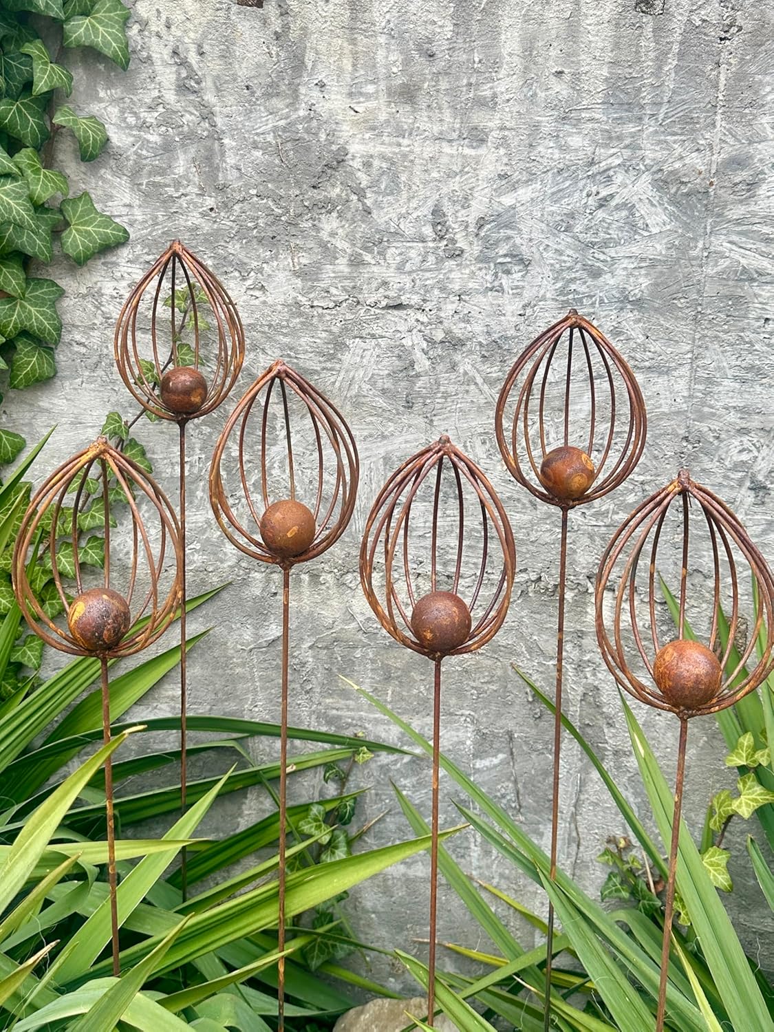 Elevate your garden with the timeless charm of this handcrafted set of six rustic metal finials. Each piece brings a warm, artistic accent to outdoor landscapes—perfect for flower beds, garden paths, planters, or even your front entrance. Their sculptural presence adds a romantic touch and natural elegance to any setting. Their weathered finish not only enhances their beauty but also makes them exceptionally durable in all seasons. Sun, rain, or snow—these pieces will continue to complement your space with their earthy appeal. A wonderful gift idea for garden enthusiasts, these metal sculptures add a personal, nature-inspired touch to any outdoor décor.