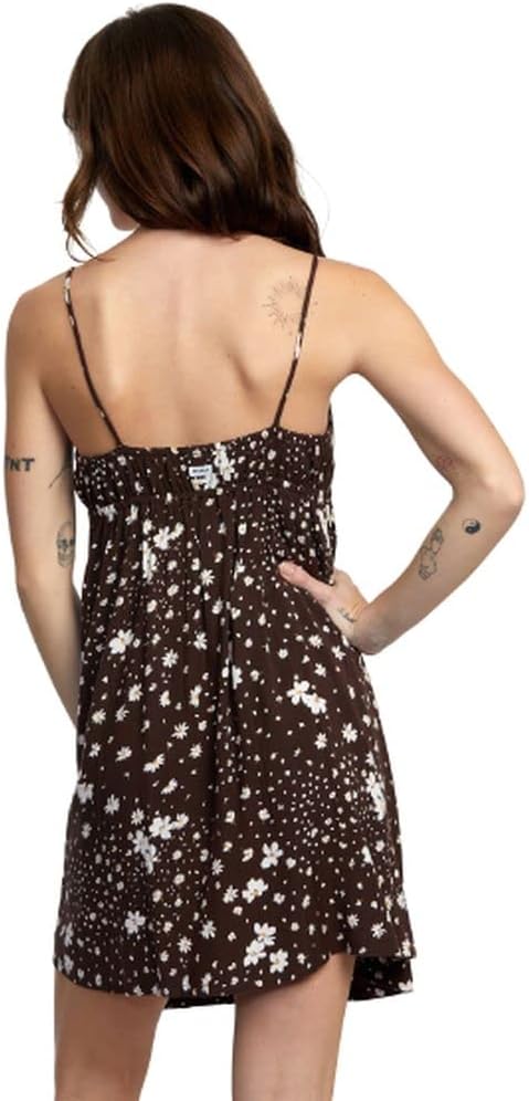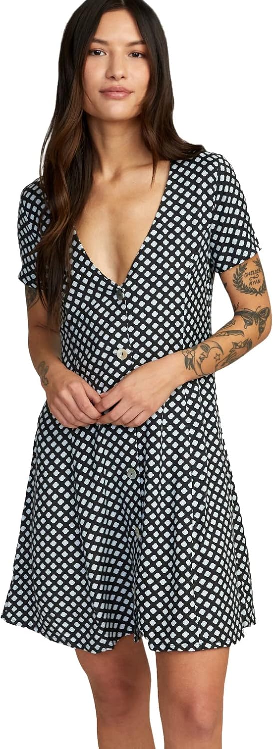 This charming RVCA dress captivates with its floral print and graceful A-line skirt. Crafted from breezy viscose, it offers a lightweight, flowing feel. Featuring short sleeves, front button closure, and elastic back strap for a perfect fit. A must-have for women, this mini dress is woven, fit and flare, 100% viscose.