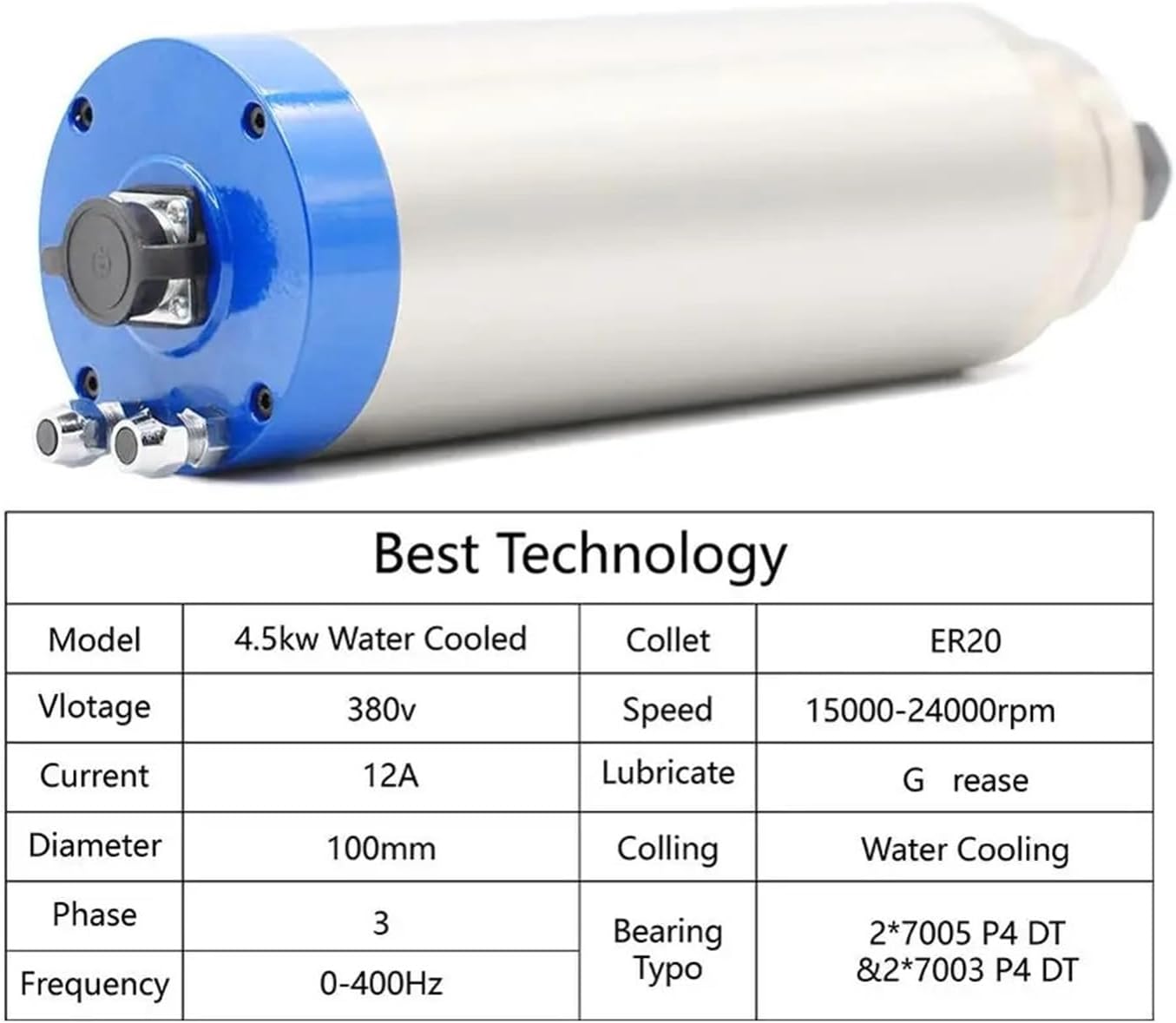 Slotting Cutter ArborsSize: 100x300mm (middle body diameter: 100mmx length: 300mmMaterial: 304 stainless steel jacket, water jacket is die-cast aluminum tube, high temperature resistant copper coilSpeed regulation mode: 0-24000 stepless speed regulation can be achieved by adjusting the inverter output voltage and operating frequencyCooling method: water coolingPower: 4.5KWVoltage: 220V/380VCurrent: 16A/12AFrequency: 400HzSpeed: 0-24000rpmRunout deviation: 0.01mmDiameter(mm):100Bearing type: 4 bearingsChuck: ER20Clamping knife diameter: 1-13mm, 3.175mm, 6.35mm, 12.7mmWater-cooled ER20 chuck block