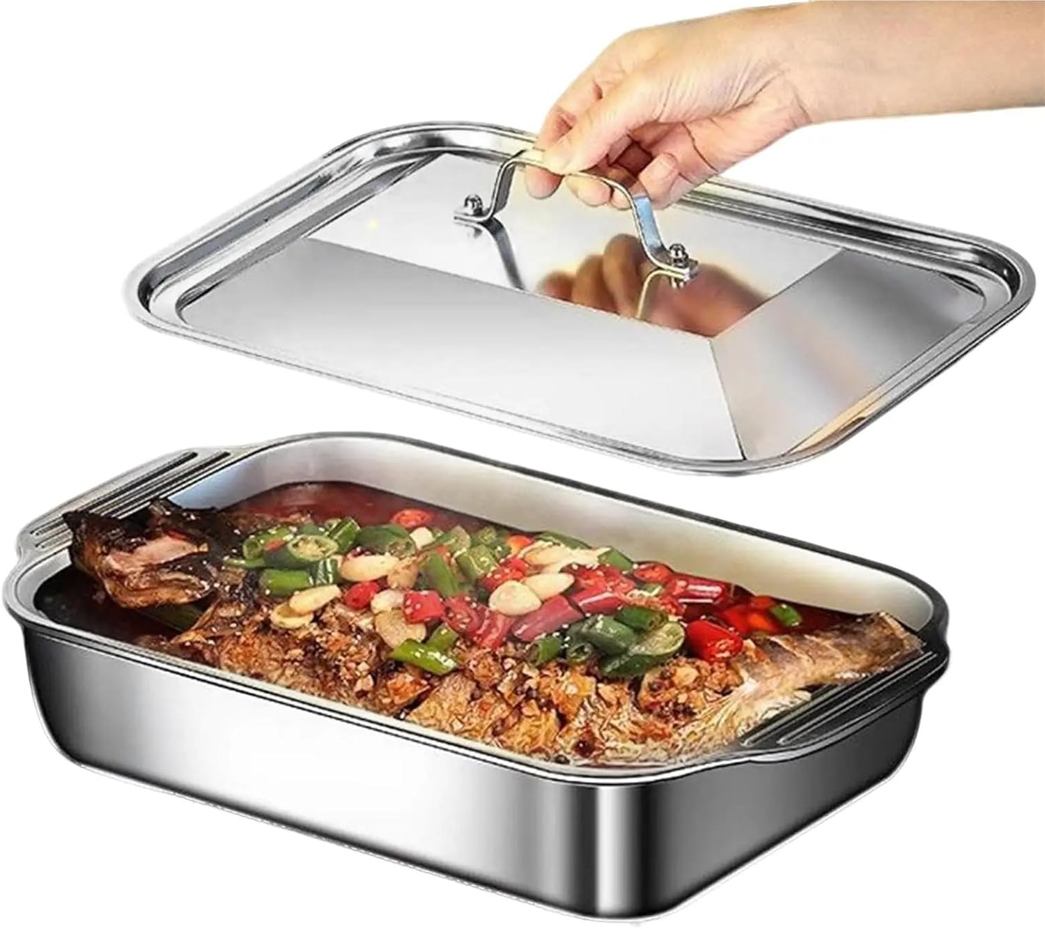 Type: Stainless Steel Baking Pan with LidApplication: Oven baking, grilled fish, lasagna, cake makingMaterial: Stainless SteelFeature: With matching lid, deep basin designUsage Scene: Home kitchen daily cooking and bakingHigh-concerned chemical : None