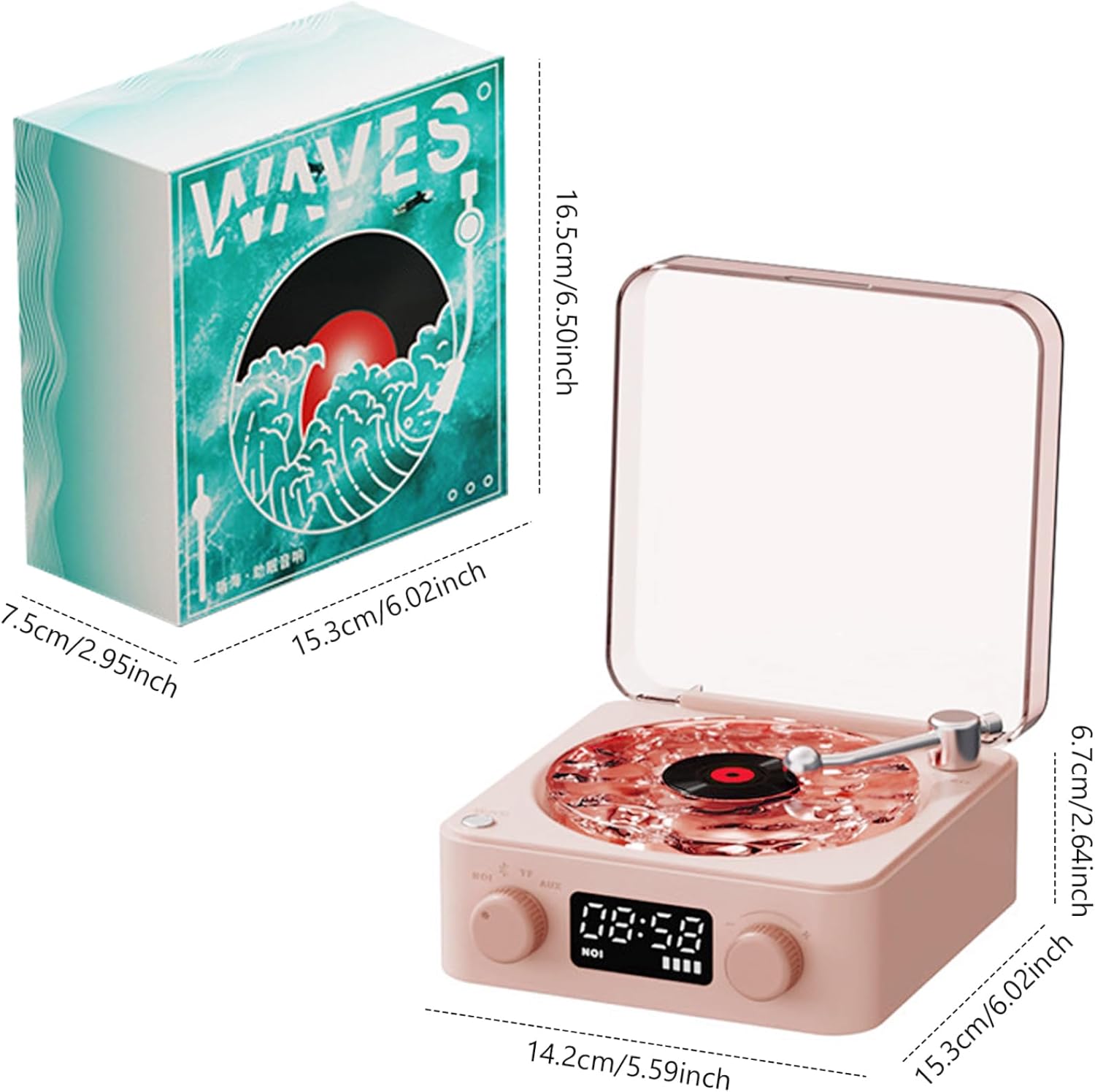 Description: The vinyl record player combines modern technology with vintage charm, offering four versatile playback modes: white noise, wireless, card, and AUX. This ensures it meets all your listening preferences, from streaming music to enjoying classic vinyl. The player features an elegant water waves design with ambient lighting, adding a relaxing and stylish touch to any space. Its high-fidelity surround sound delivers rich, immersive audio, capturing every detail of your favorite tracks. Smart control features like rotary volume adjustment and double-tap song switching make it user-friendly and convenient. Additionally, the gramophone-style tonearm adds a nostalgic feel, making this record player a perfect birthday gift for music enthusiasts. Combining superior sound quality, aesthetic appeal, and ease of use, this vinyl record player is an ideal addition to any music lover's collection. Features:. vinyl record player. -Color: as show. -Material: PP. -Size: about 15.3x14.2x6.7 cm/6.02x5.59x2.64 inch. -Version: 5.0. -Battery capacity: 1500mAh. -Product weight: 498g. -Use time: 4-6h. -Charging time: 2-3h. -Input voltage: 5V-1A. -Output power: 5W. Note: Manual measurement, please allow slight errors on size. The colors may exist slight difference due to different screens. Package Including 1 * vinyl record player1 * USB cable1 * specification