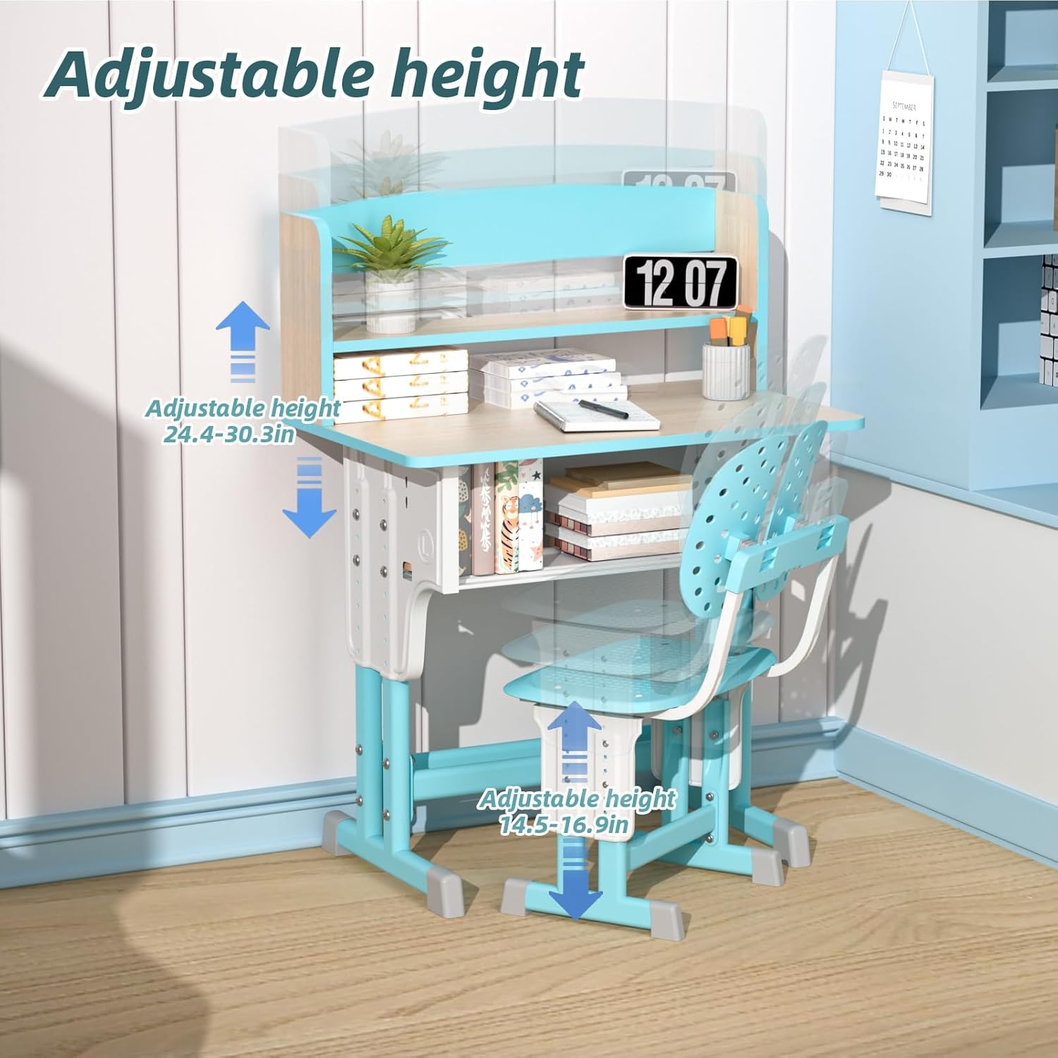 Item Name: Desk Chair Set Material: Wood Ages: 7-12 Years Old Features: Adjustable Height, Storage Drawer, Backpack Hooks Size Details: Desk: L: 60cm/23.62", W: 45cm/17.72", H: 107cm/42.13" (Approx.) Desk Height: 92cm-107cm/36.25"-42.16" (Approx.) Chair Height: 37cm-43cm/14.58"-16.94" (Approx.) Notes: Due to the light and screen setting difference, the item's color may be slightly different from the pictures. Please allow slight dimension difference due to different manual measurement. Package Includes: 1 x Desk 1 x Chair