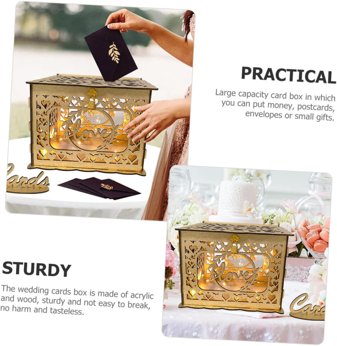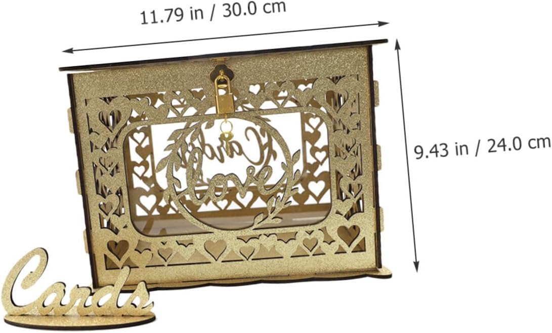 Package Include 1 x Wood Box 1 x Sign 1 x Lock 2 x Keys Features -Size:30.00X24.00X22.50cm/11.79X9.43X8.84in -Material:Wood,Acrylic -Color:Golden -Product Info:Wooden hollow decorative box - Elegant design: This party cards box allows your guests to put down cards and notes of wish. wedding card holder - The wood cards box for wedding is beautifully made with a delicate hollow design, very delicate card boxes. - This wedding cards box can be applied to hold cards, money, envelopes, postcard, photos and small wedding card boxes. - A great decoration that adds to your theme atmosphere. Bring more romantic atmosphere for your wedding. - Wedding reception box, an way to store your cards or envelops. Can also decorate your wedding table.Goods Informationwedding card holder made of wood, with an elegant hollow design, carefully crafted to complement the modern wedding styling.card boxes for parties the unique decoration of the wedding table, or let the individual appearance of the box exist independently.greeting cards container Are you looking for a wedding table wooden cards box? This wooden box will be your good choice