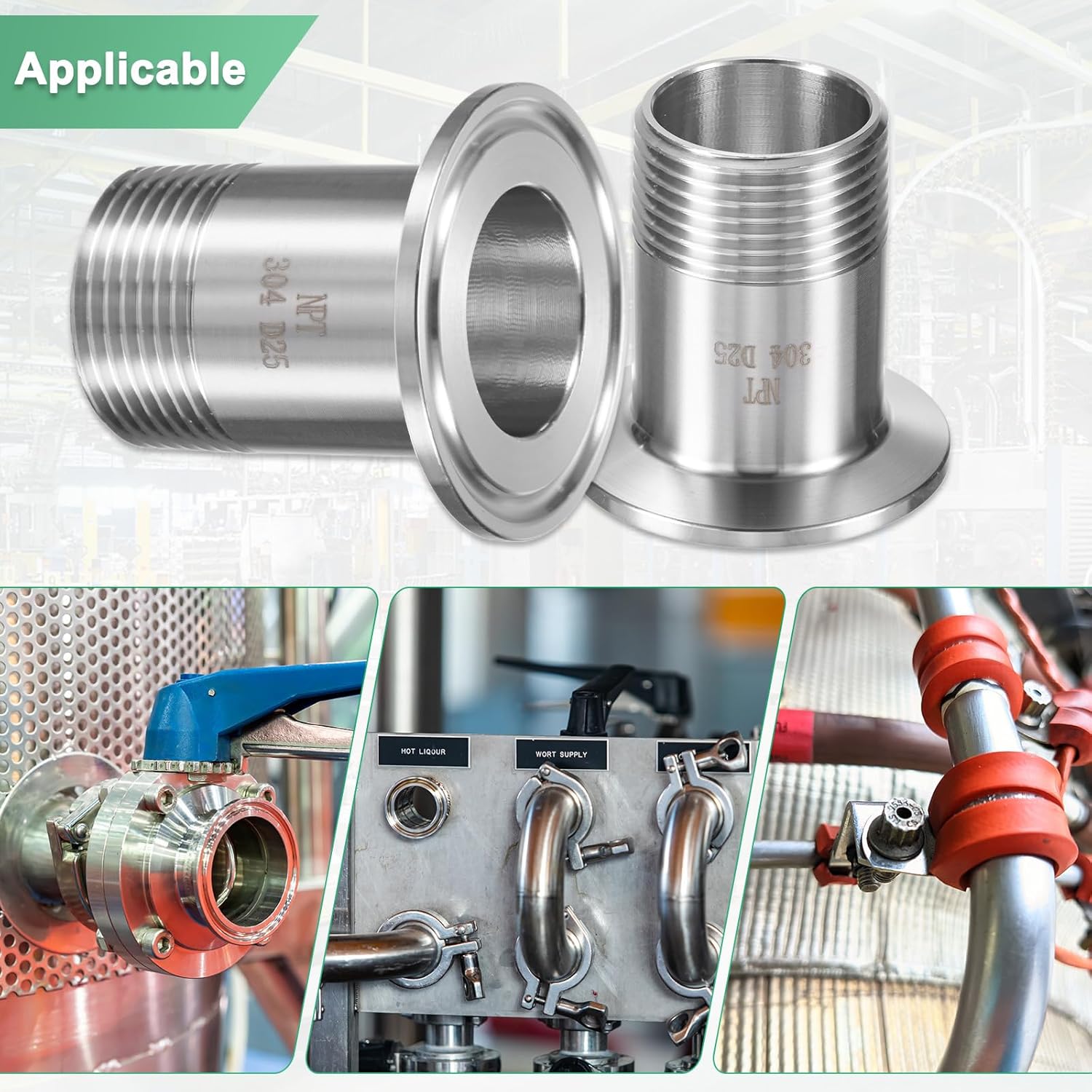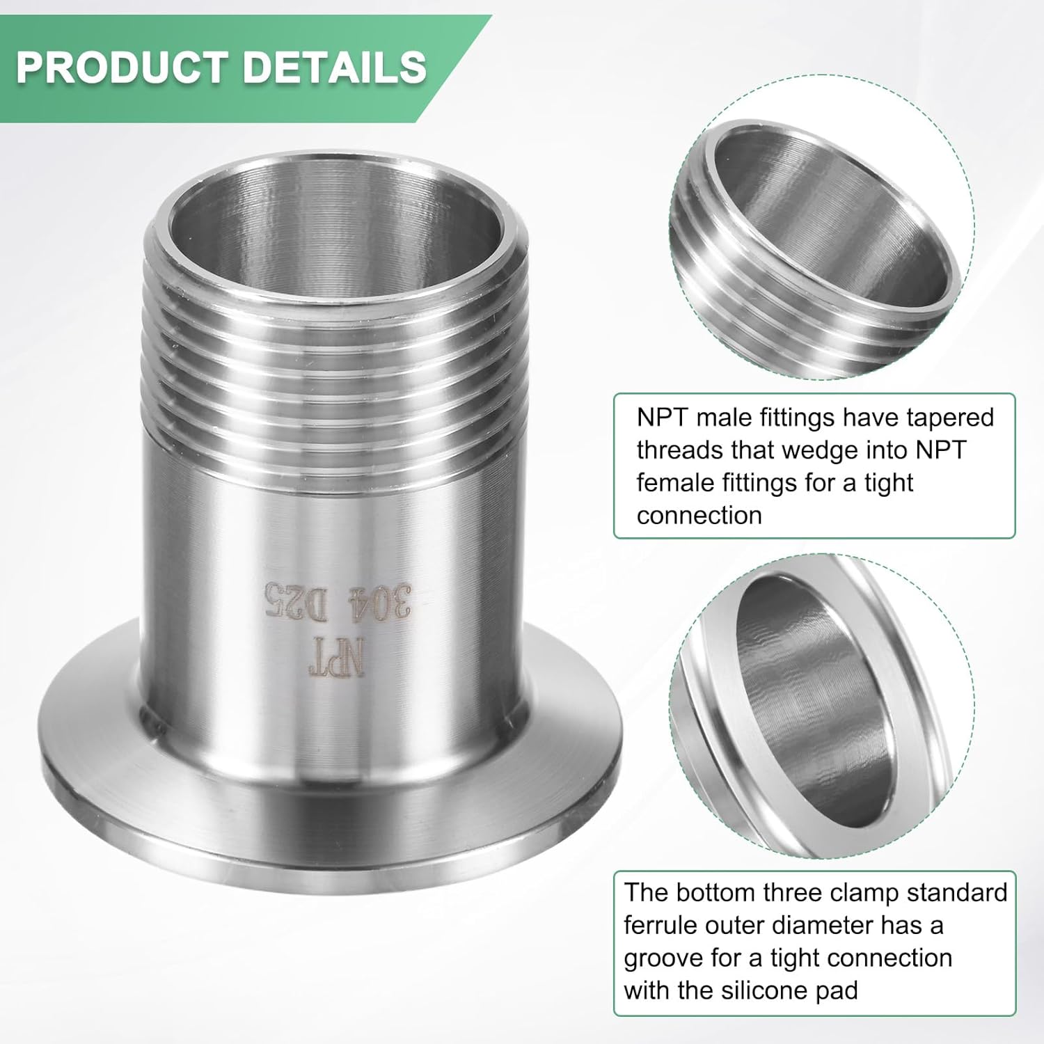 PRODUCT APPLICATIONThe three-clamp connector is widely used in beer, wine, food, beverage, dairy and other industries. It is used as a pneumatic or hydraulic connector to connect pipes, tubes and hoses.PRODUCT DETAILS√ Type: Sanitary Pipe Fittings√ Material: 304 Stainless Steel√ Color: Silver√ Height: 1.97 inches/50mm√ Applicable Pipe Size: 1 inch NPT Thread√ Ferrule Outer Diameter: 50.5mm√ Applicable Tee Clamp Size: 1.5 inch√ Package Includes: 1 pcs Sanitary Pipe FittingsPRODUCT ADVANTAGES1. The material of the three-clamp joint is 304 stainless steel, which has excellent corrosion resistance and high temperature resistance, a smooth and flat surface, easy to clean, and a long service life.2. NPT standard thread, suitable for most standard pipe connections. The bottom three-clamp standard ferrule outer diameter, the groove is tightly connected with the silicone pad.ATTENTIONPlease confirm the required connecting pipe and clamp size before purchasing to select the correct size product.