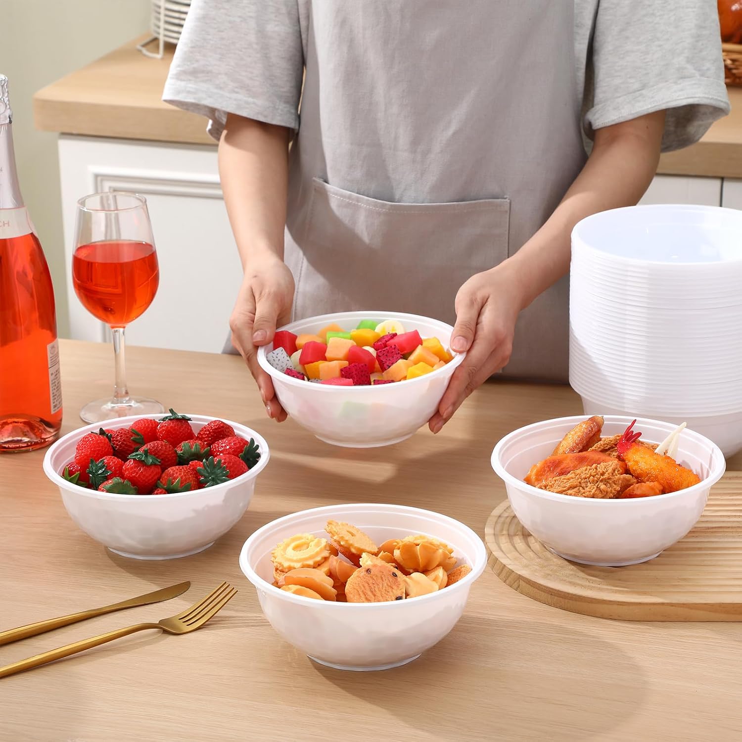 Features: These white plastic bowls are recyclable, making them an environmentally conscious choice. Enjoy the convenience of disposable bowls without contributing to waste. No matter if you're hosting a grand holiday feast, a baby shower, or a get-together with friends, our disposable plastic bowls rise to the occasion. Specifications: Material: PP5 plastic Color: white Size: 36 oz Package includes: 100 x Disposable plastic bowls Notes: Manual measurement, please allow slight errors on size. The color may exist a slight difference due to different screen displays