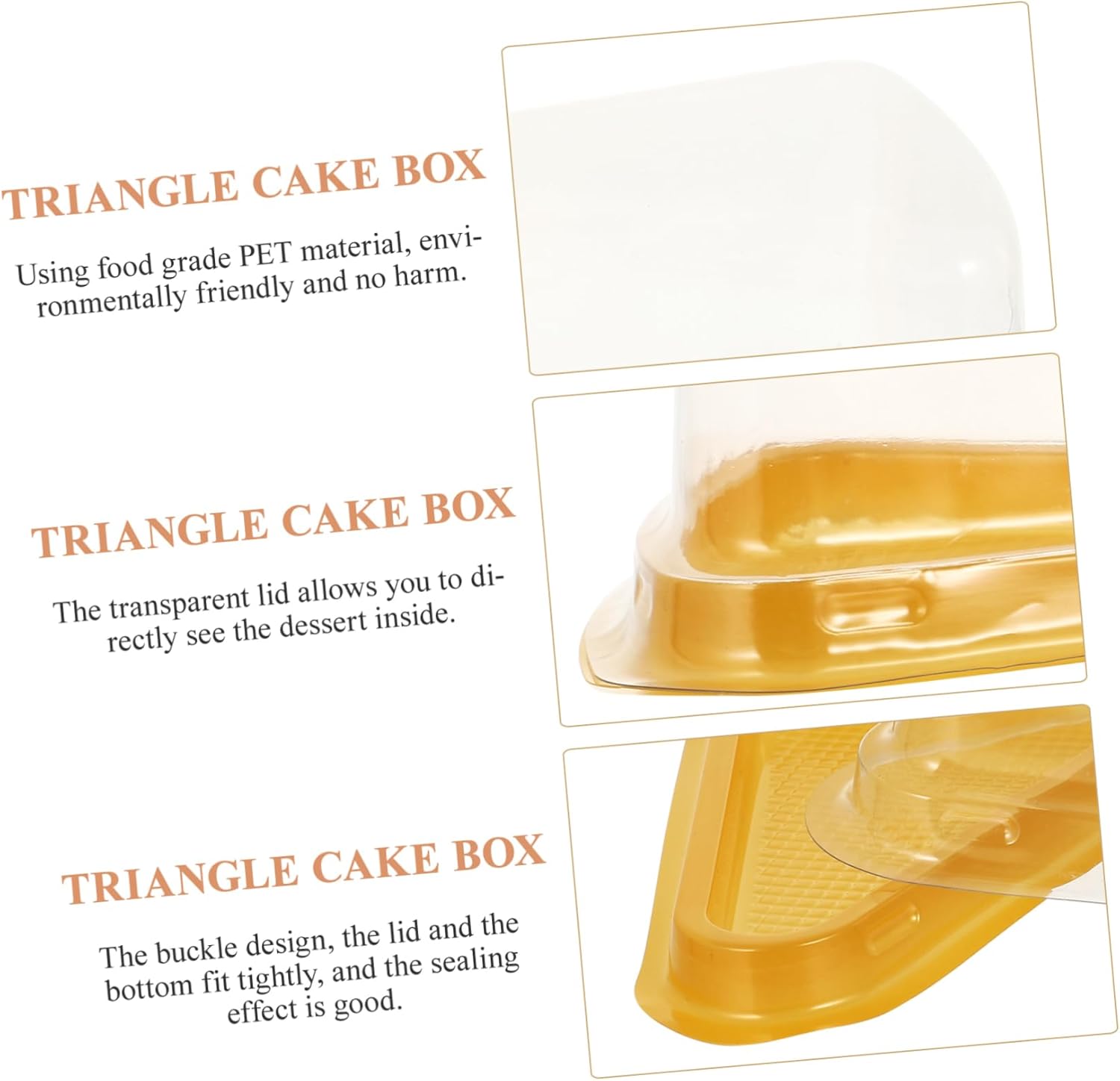 Package List cake boxes Features -Material: PET triangle food container. -Size: About 14x11x7.5cm/5.5x4.32x2.95 inch cupcake container. -Product Info:Cake box -The buckle design, the lid and the bottom fit tightly, and the sealing effect is good cake packaging. -The groove design of the base is non-slip and better protect food cake packaging boxes. -The transparent lid allows you to directly see the dessert inside cake storage container. -Using food grade PET material, and no harm cake carriers. -Transparent lid packaging box, beautiful and practical triangle cupcake holders.Goods Descriptionpastry slice packaging triangle These are triangle cake wrapping boxes, which are made of material for safe to use.cupcake packaging Each box features a transparent cover and can just put in.cupcake packaging containers It is also for storing cheesecake, mousse cake and other desserts for home and bakery use