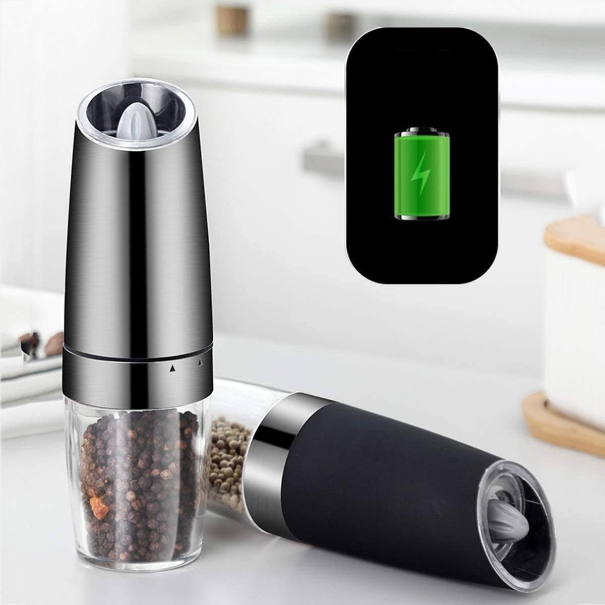 Two-piece electric salt and pepper grinder with ceramic grinder I Electric pepper mill and salt grinder, salt and pepper grinder spice grinderThe turning wheel on the top allows you to completely change the degree of grind, from very fine to very coarse! The professional ceramic grinder allows you to turn almost all kinds of spices into the right grain: from sea salt, high-quality crystal salt, peppercorns to exotic peppers, everything is possible! Each grinder requires 6 AAA batteries (not included), which can take a long time. Operating your grinder1. To grind stars, just turn the grinder2. Turn the dial located on the head to change between fine and coarse grind. Package contains:2 * Pepper Grinders