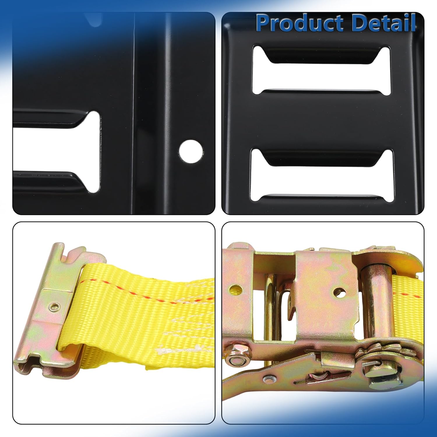 2 Set Black E-Track Wheel Chock Tie Down Kit with 9' Yellow Heavy Duty Trailer Tire Ratchet Straps 4500lbs Break StrengthFeatures:Simple and easy to useWon't stretch or shrink even when wetIt can also be flexibly used in narrow spacesMade of good material, making it very strong and sturdyFitment:Replacement for securing trucks, ATV, UTV, trailers, tractors, landscaping equipment, quads, furniture, tools, warehouses cargo, storage containers, oil drums, boats in trailers and moreSpecifications:Color: black and yellowType: e-trackBreak strength: 4500 lbsInstallation type: direct replacementPackage included: 2 x Wheel Chock Tie Down Kitwith screws and nuts