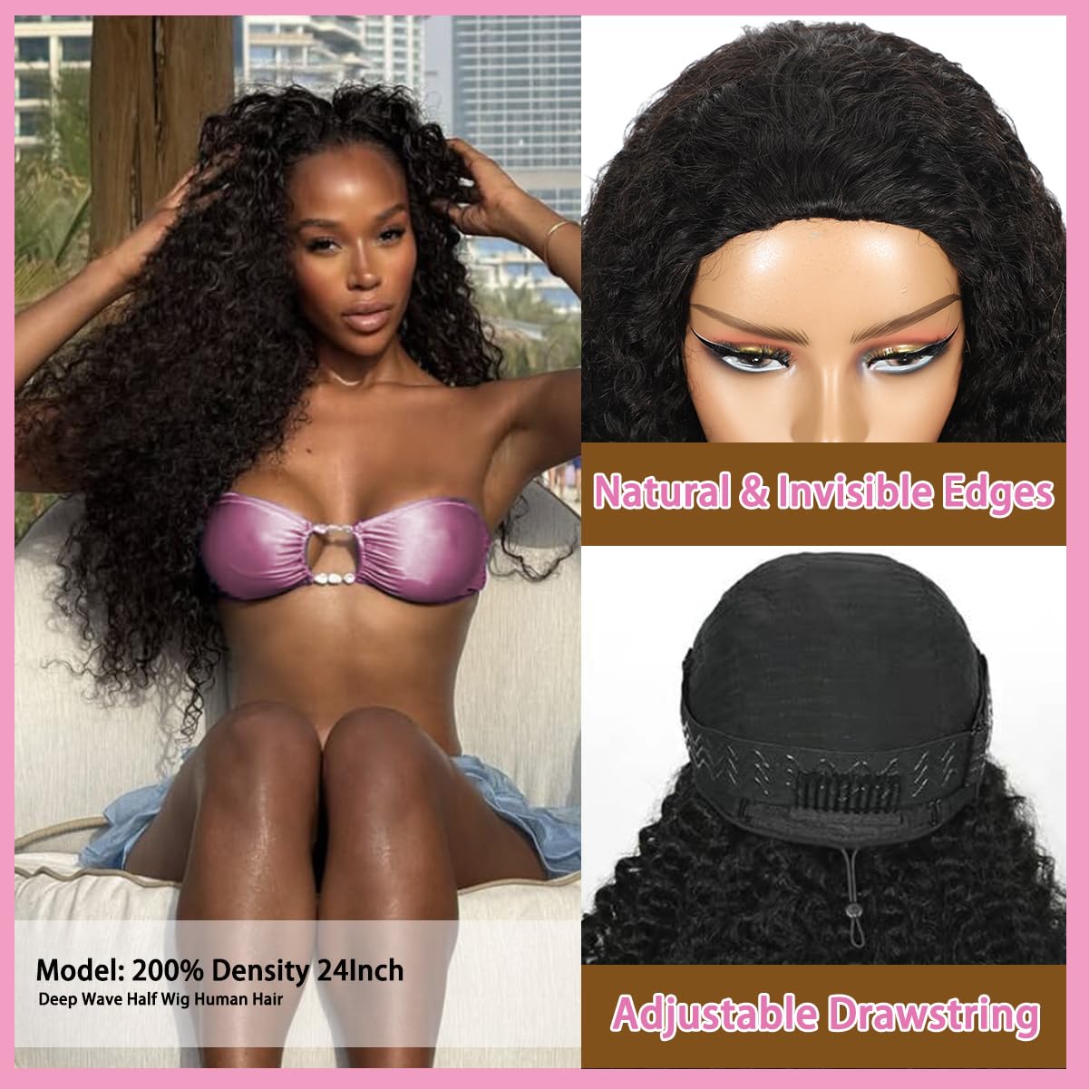 | Hair Type | thick, half wig,100% human hair, 200 density, deep wave half wig, 3 in1 glueless drawstring seamless flip over half wigs, invisible hairline |