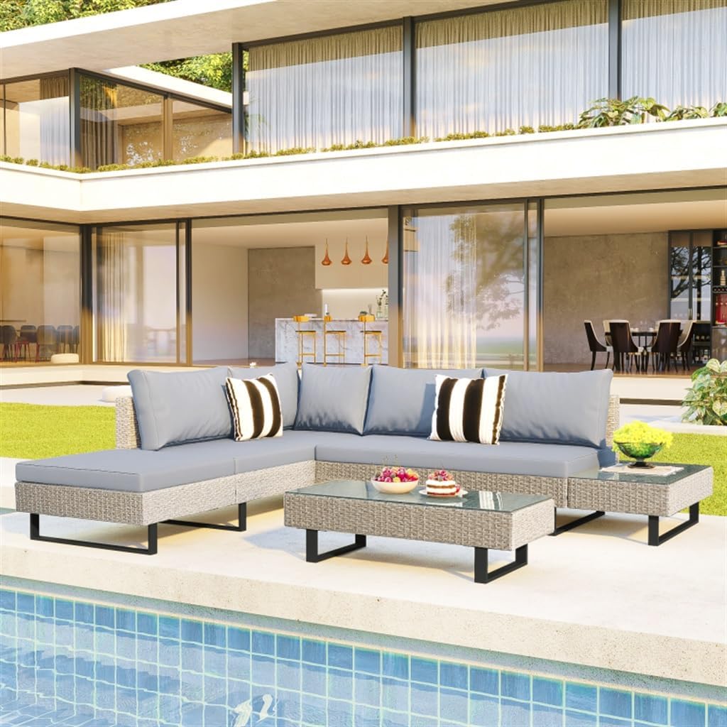 This wicker sofa set consists of sturdy iron frame, tempered glass, simulated plastic wicker and cloud-soft cushions. The combination of those powerful properties makes this product an incomparable advantage as a group of outdoor furniture.This wicker sofa set has two transparent glass countertop to fully meet your placement needs. They are rests securely on the sturdy wicker table, linked via suction cups. the tables are topped with a tempered glass surface that's for placing down drinks, while also allowing a sophisticated touch. A good choice is for 4 to 5 friends to have a drink and relax and enjoy an outdoor party together.The L-shaped corner sofa with iron leg structure of this wicker sofa set is of the biggest features. Sturdy cross bar under the sofa for reasonable bearing ability. A variety of placement methods suitable for any corner of the home.for any and match, will bring your outdoor life fresh and natural beauty.Both tables and sofas come with adjustable feet, and they can also be height-adjusted by rotating for high stability even on uneven ground. Those connectors are also very strong and not easy to loosen.The uniques beige wicker is hand-woven to bring you the most authentic and natural comfort. Those cushions are made of a special spill-resistant material fabric that is waterproof, UV-proof for many years to use. And the tempered glass surface for no-scratch. They only need a rag to keep them clean and tidy. While those pillows are equipped with zippers and only needs a simple cleaning.MaterialPE Wicker +Steel frame + Glass+SpongeColor GrayL-shaped Corner Sofa 76.4”x 26.8”x 23.2”Double-Seat Sofa 65.4”x 26.8”x 23.2”Glass Table 35.4”x 19.7”x 9.8”Overall Product Weight 108 lbsPackage Weight 130 lbsPackage includes:L-shaped Corner Sofa*1Double-Seat Sofa*1Glass Table*1(no other presentation items included).Notice:1. Due to manual measurement, please allow 2-3% error, before you bid, please make sure you don't mind.2. The color may vary due to different displays, please refer to the actual product.