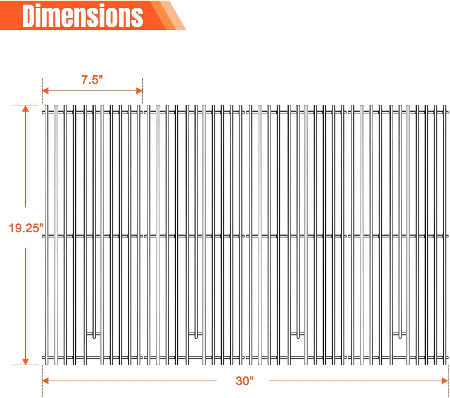 Package includes 4 pcs Griddle GratesDimensions: 19.25"x7.5" for each grate, 19.25"x30'' for 4pcs total.Material: Heavy Duty Stainless SteelPlease Note:To ensure you choose the correct replacement cooking grate for your grill, we recommend removing the original part and comparing it to what we list.