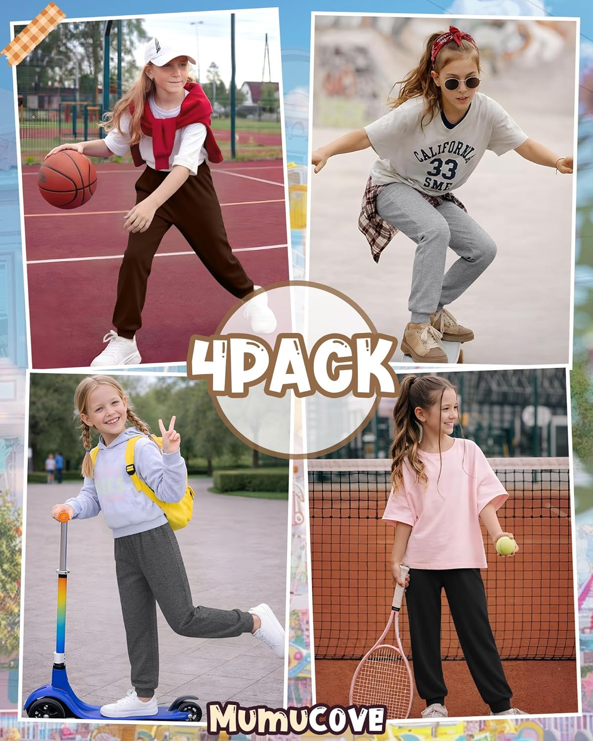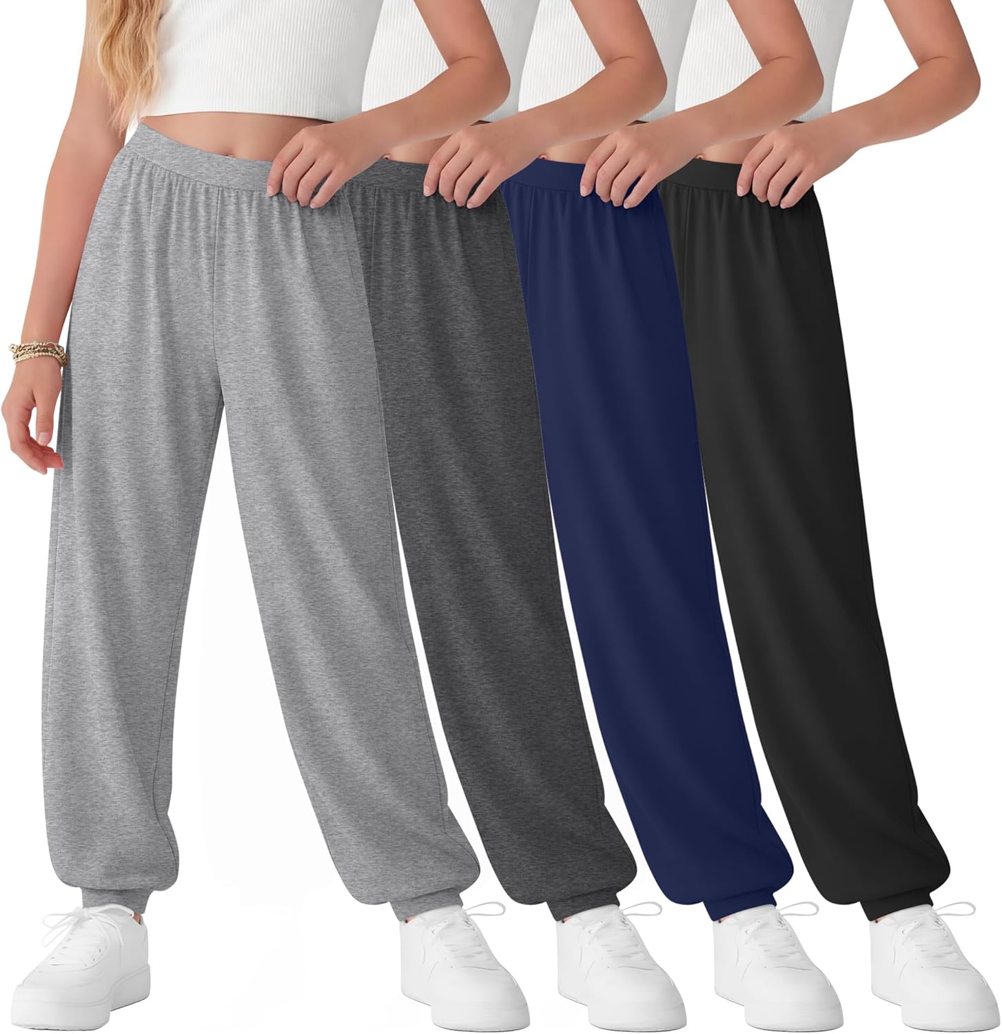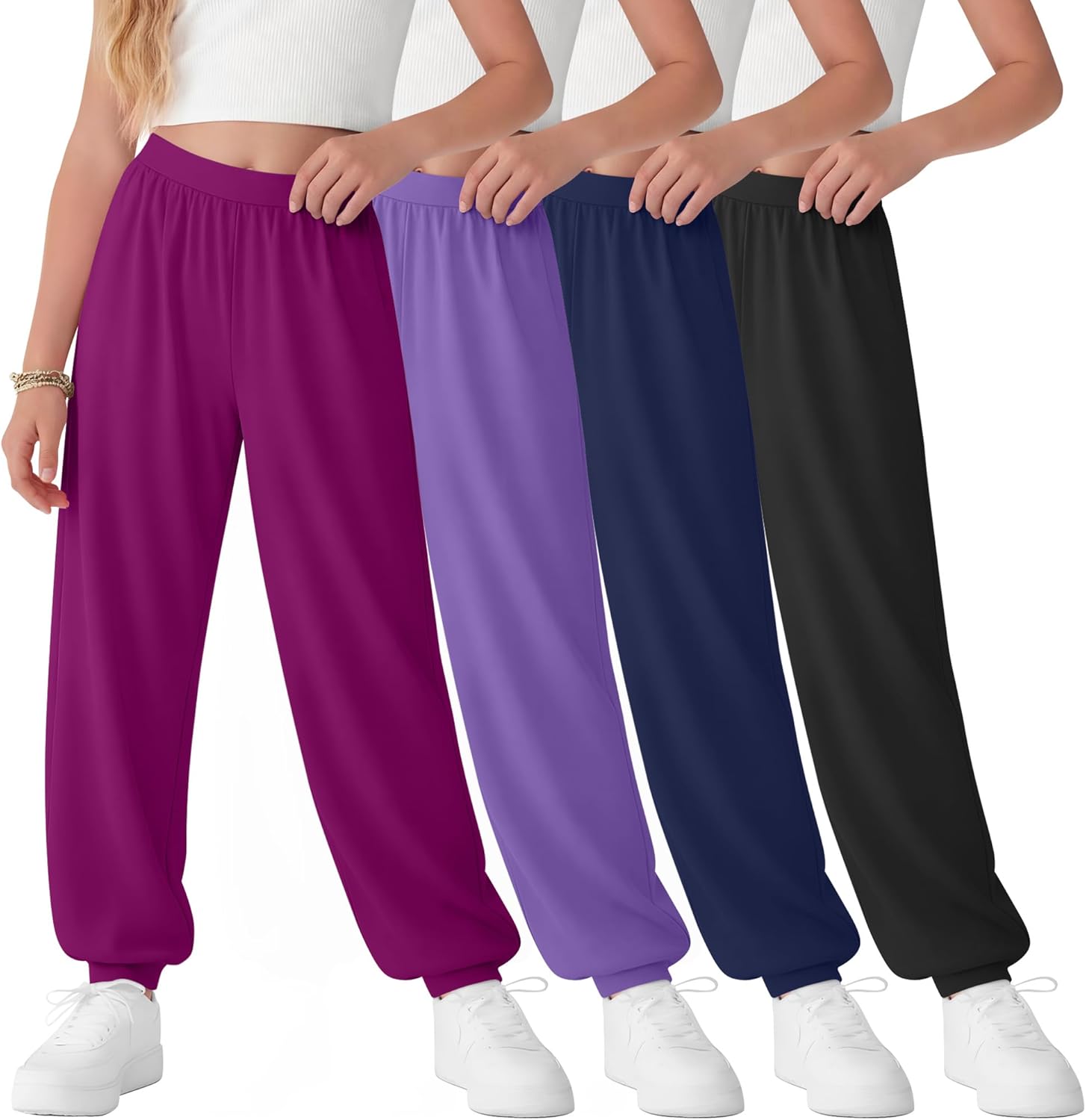 Diverse combinations: The girl's jogger sweatpants are made of soft, breathable, skin-friendly fabric and provide kids with maximum comfort, support and coverage when they play sports, perfect for everyday activities, meeting your child's need for wear. Available in a variety of stylish colors, they're not only comfy but also let her show off her unique personality. Whether she loves bold brights or everyday neutrals, there's a look she'll feel confident in. Mix and match to create endless outfits for your child to wear. Specifications: Material: 60% Polyester, 35% Cotton, 5% Spandex Package includes: 4 x girls' jogger sweatpants Notes: Manual measurement, please allow slight errors on size. The color may exist a slight difference due to different screen displays. Check the size chart before purchasing, as it would help you find a more accurate size for yourself. Hand/machine wash in gentle with cold water, hang to dry or line dry, wash dark colors separately