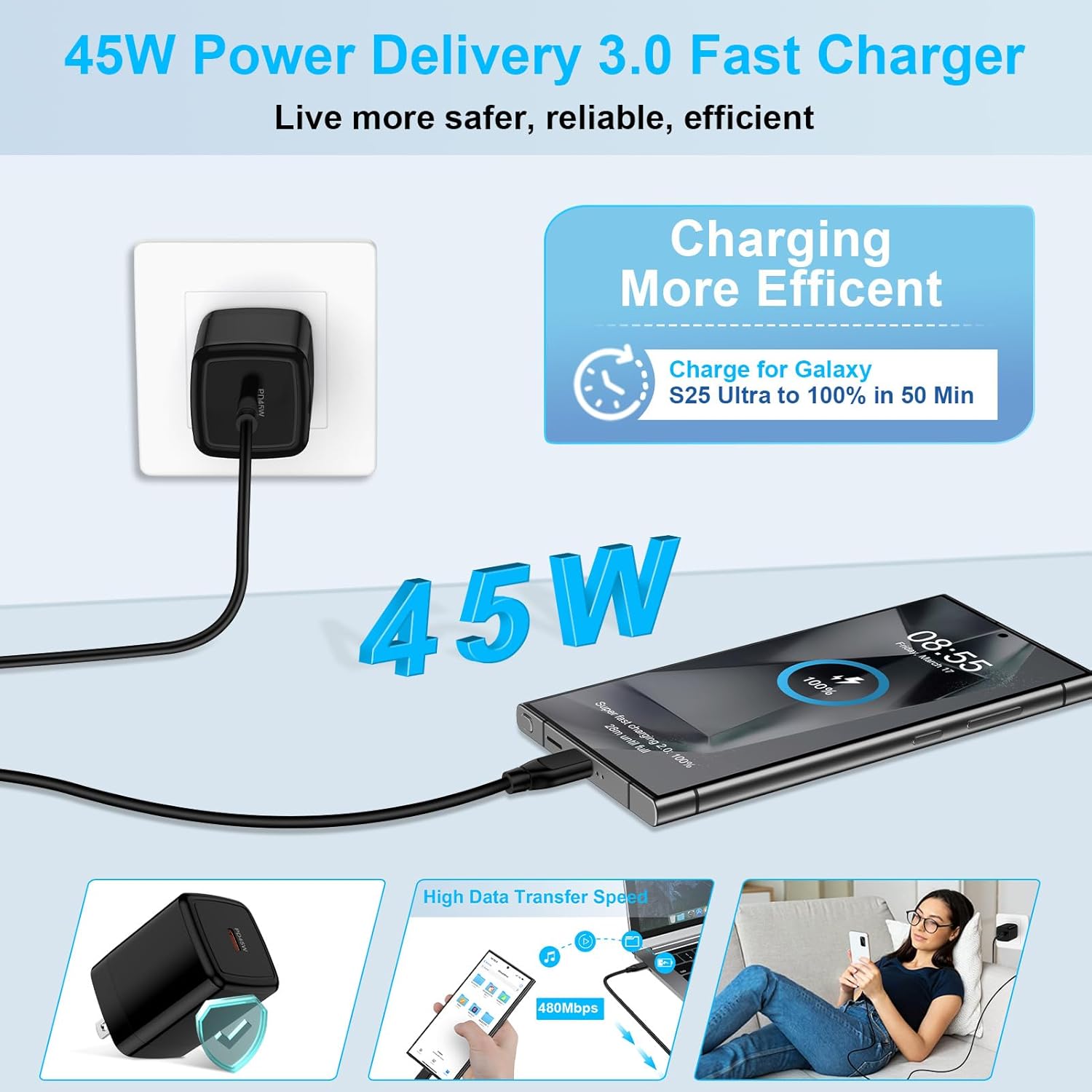 45W for Samsung Super Fast Charger Typy C for Samsung Galaxy S26 S25 S24 S23 S22 A16 A15 A56 A36 Specifications: Wattage: 45W Input: AC110-240V/1.2A, 50~60Hz Output: (PDO)DC5V/3A, 9V/3A,15V/3A, 20V/2.25A (PPS)3.3-11V/4.05A, 3.3-16V/2.8A, 3.3-21V/2.1A Connector Type: USB C Product Features: 1. 45W Super Fast Charging: 45W Super Fast Samsung Charger Type C Charging power up to 45W, charge Samsung Galaxy S26 Ultra up to 50% within 20 mins, 100% within 50 mins. Much faster than old 20W, 25W charger. 2. Superior Safety: Built-in Multi-Protect system, Samsung Galaxy S26 Ultra Charger protects your phones/tablets/laptops against over-load voltage/current, short-circuit and over-temperature. Automatically stops charging when battery capacity is full. 3. 6ft USB C to USB C Cable: Attached USB C to USB C fast charging cable charges at 3A super speed, transfer speed 480Mb/s. 6ft extra long charging distance is sufficient to meet the needs of any charging scene. 4. Compatible Protocols: PPS, PD, Super Fast Charging 2.0, Super Fast Charging Wide Compatibility: for Samsung Galaxy S26/S26+/S26 Ultra/S25/S25+/S25 Ultra/S25 FE/S24/S24+/S24 Ultra/S24 FE/S23 FE/S23/S23+/S23 Ultra for Samsung Galaxy S22/S22+/S22 Ultra/S22 FE/S21/S21+/S21 Ultra/S21 FE/S20/S20+/S20 Ultra/S20 FE for Samsung Galaxy Z Flip 7/6/5/4/3/2, Z Fold 7/6/5/4/3/2, Note 20/10/9/8 for Samsung Galaxy A16 A15 5G A14 A13 A17 A56 A55 A54 A53 A36 A35 A34 A32 for Samsung Galaxy A23 A24 A25 A07 A06 A05s A04s A03s A10E A11 A21 A51 A71 A20 A50 A9 A01 for iPhone 17/17 Pro/17 Pro Max/Air/16e/16/16 Pro/16 Pro Max/16 Plus/15/15 Pro/15 Pro Max/15 Plus for Google Pixel 10/10 Pro/10 Pro XL/10 Pro Fold/9a/9/9 Pro/9 Pro XL/9 Pro Fold for Google Pixel 8a/8/8 Pro/7a/7 Pro/7/6a/6/6 Pro/5/4/3/2/XL Package Includes: 2Pack 45W Super Fast Charger Type C 2Pack 6FT USB C to USB C Cable