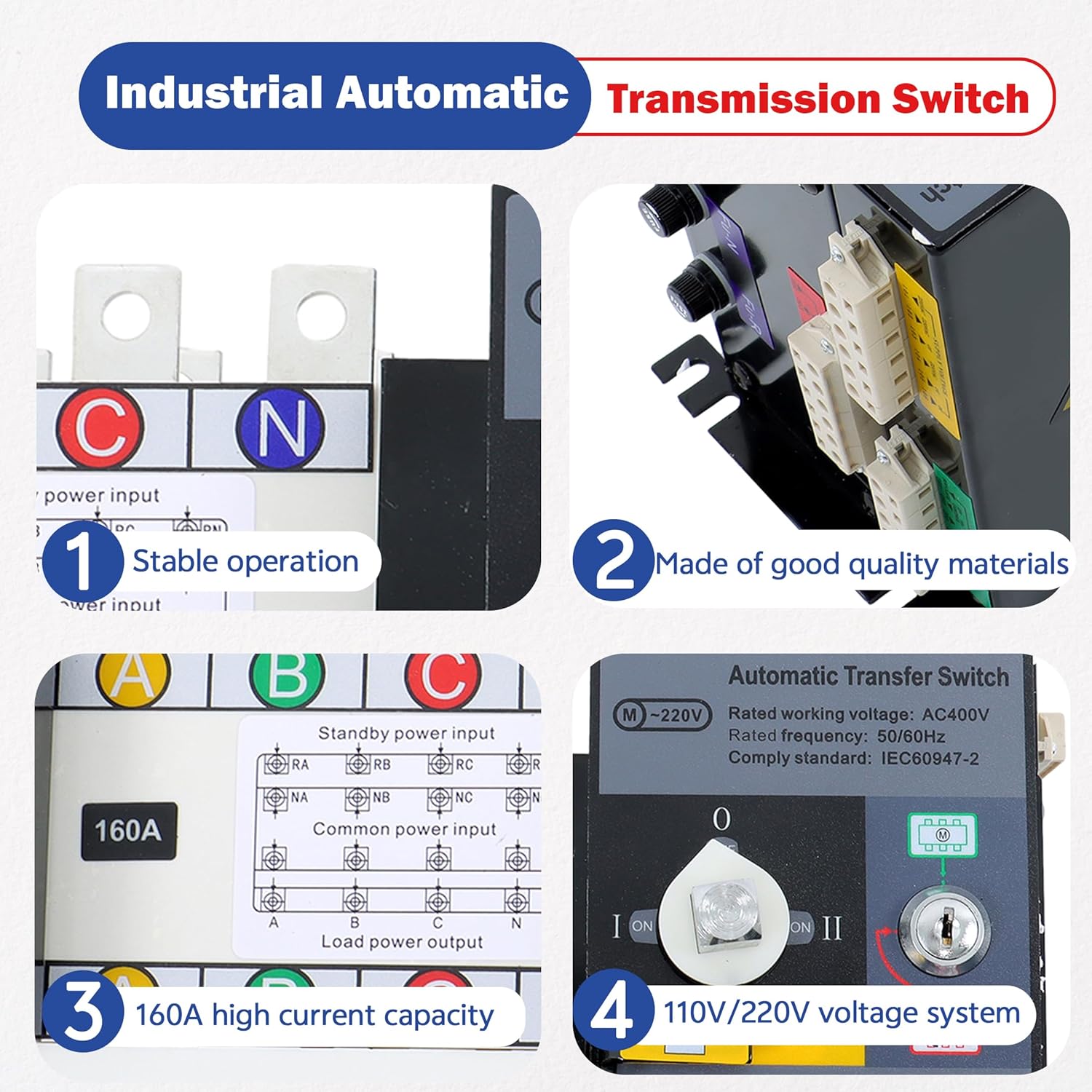 4P 160A Industrial Automatic Transmission Switch ATS AC Generator Set 110V 220V Dual Power Switching SwitchSpecification:Material: Copper, PlasticRated current: 160AVoltage: 110V 220VCompatibility: The 160A ATS can also be used for the normal operation of household appliances, refrigerators, and other devices, ensuring that there will be no inconvenience caused by power outagesFeatures:Frequency sensing technology, real-time monitoring of primary and backup power status, fast switching speed, in line with industry standardsCompact structure, made of industrial grade materials, suitable for harsh environments such as outdoor or computer roomsModular design simplifies wiring, compatible with standard installations, and reduces installation time