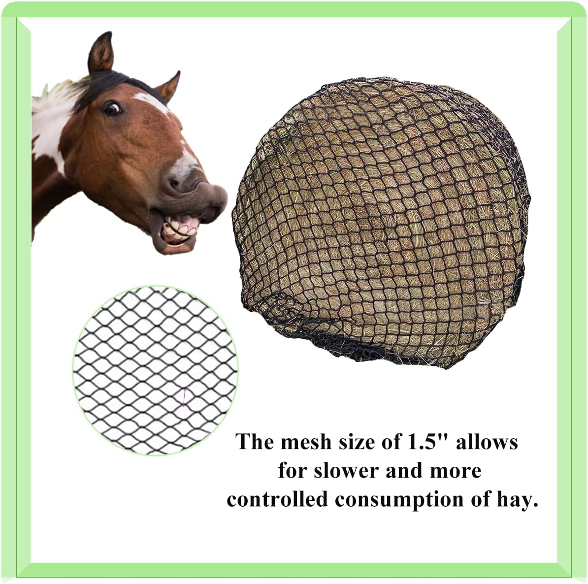 Extra large time-saving slow feed hay nets for horsesParameterName:Large Round Bale Hay Net for HorsesSize: 5Ft x 5Ft x 5Ft inchesMaterial: PEColor: blackApplications:Our slow feed hay nets for horses feature a lightweight design that makes transportation and installation a breeze, making it easy to provide essential hay for your horses whether they're in the barn, in the pasture, or on the go!Package ContentsLarge Round Bale Hay Net for Horses x 1 Pcs66ft repair twine x 1 PcsNetting needle shuttle x 1 PcsSelf Locking String Ties x 20 PcsAttentionGoods due to long time transportation, individual products may be defective, if you encounter defective products, please contact us for replacement!As the above dimensions are measured manually, the actual size of the item you receive may be slightly different from the above dimensions.Due to the monitor, camera or other factors, there may be a slight color difference
