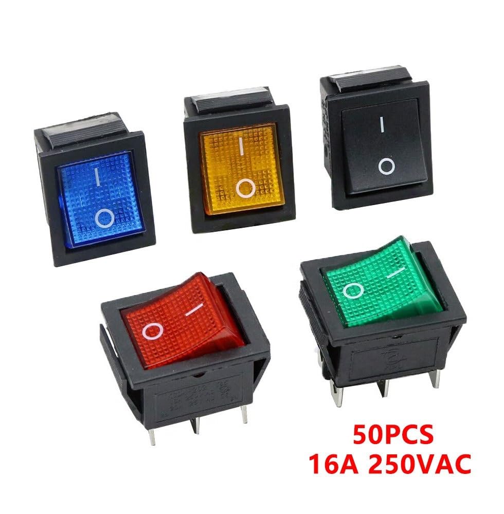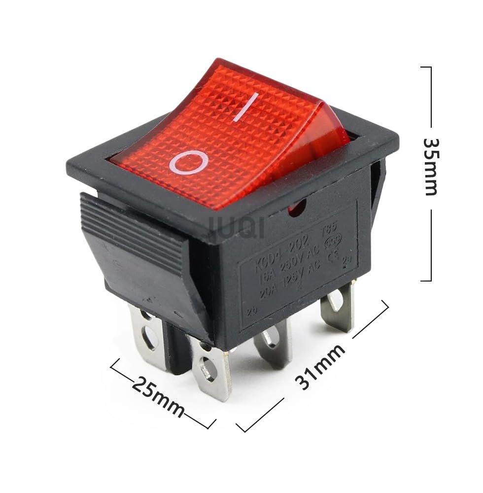 Product Name: Rocker SwitchPoles: DPDT Color: red yellow blue Green Light blue Terminals: 6-Pin (On/Off) Action Type: Latch Rating Voltage: AC 250V 15A AC 125V 20A Size: 3.1 x 2.5 x 2.5cm Mounting Size: 3.2 x 1.6 x 2.1cm Material : Plastic, Metal Package: 50Pcs Rocker Switch Warm hint, the switch with arrow sign is self-reset, press it will automatically bounce up.