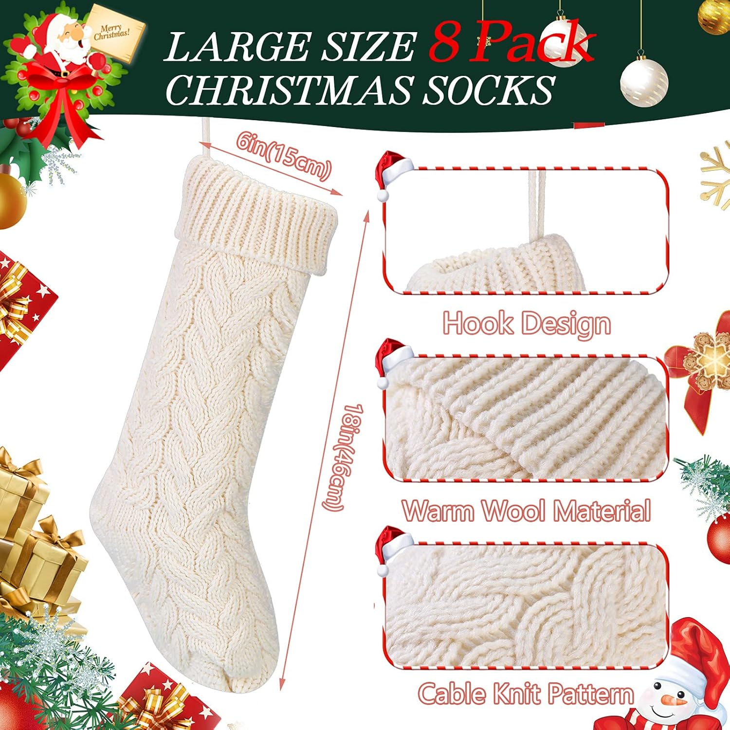 Features: Fine in workmanship: These Christmas stockings are made of soft acrylic fabric, with fun and festive Christmas knitting patterns for a beautiful shape, which will bring you and your family a warm feeling, leaving some wonderful holiday memories. Bring tons of fun: Christmas stockings are an almost universal family tradition during the holidays, which can bring warmth to children and adults, especially families. What's more, kids always get excited to see what Santa filled their stockings with during the night. Specifications: Material: acrylic fabric Color: as pictures show Size: 18 x 5 inches Package includes: 8 x Christmas stockings Note: Manual measurement, please allow slight errors on size. The color may exist slight difference due to different screen displays.