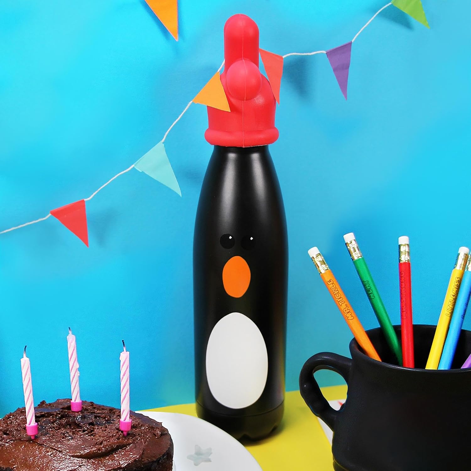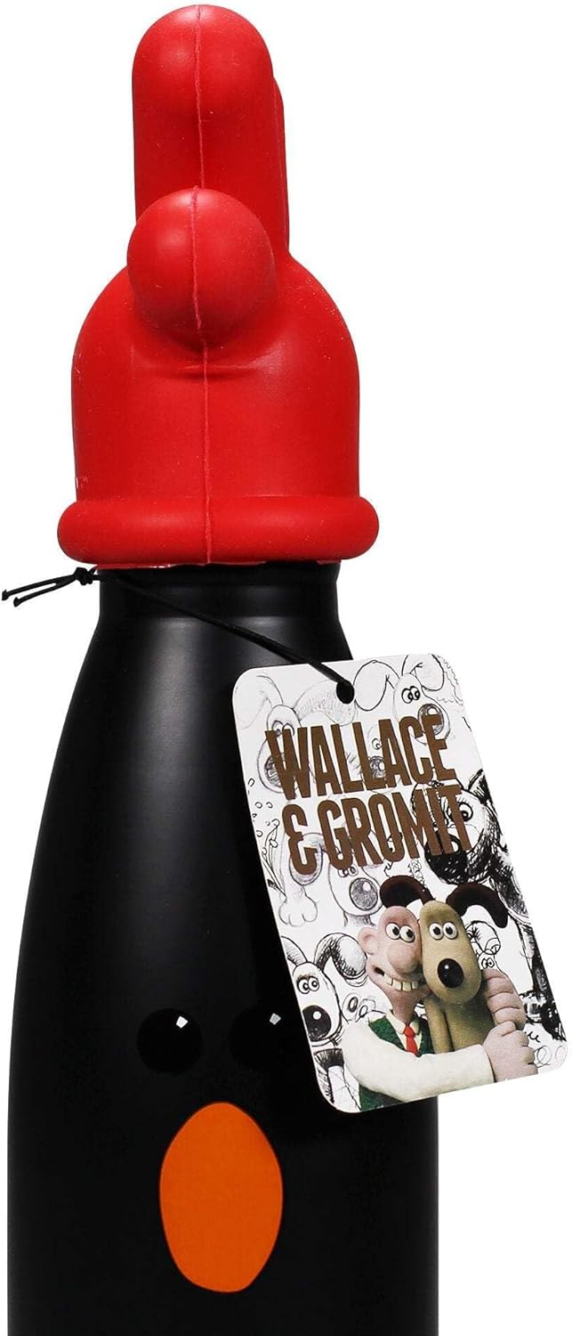 Keep it cool with this cracking water bottle inspired by Wallace & Gromit's penguin nemesis, Feather's McGraw! This double-walled metal water bottle has a black base colour with McGraw's features printed on it's front, while on the reverse you'll find a small Wallace & Gromit logo stamp. The real highlight of this novelty bottle is it's silicone pop-on, pop-off lid, which resembles the same red rubber-glove-hat that McGraw wears in the classic Aardman animation.