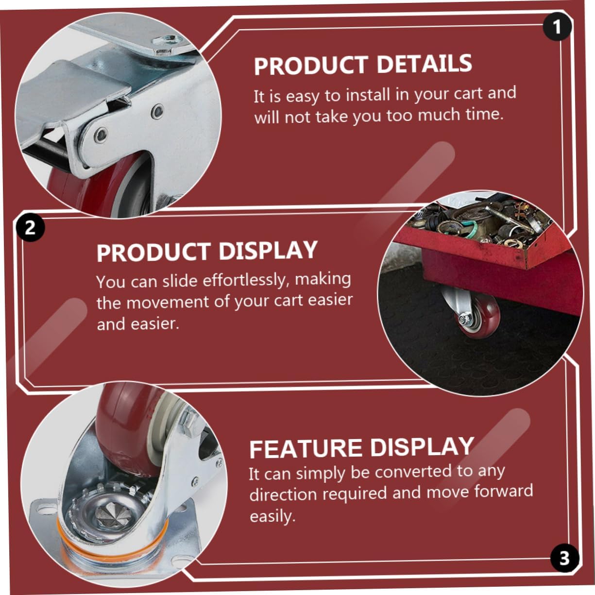 Package List 2 x 3 inch swivel wheels 2 x 3 inch swivel brake wheels Features -Size: About 10.50X9.50X6.50cm/4.13X3.73X2.55inch Cart Repairing Part. -Color: Red Cart Wheels. -Material: Steel, PVC Cart Universal Wheel. -Capacity: 4 wheels bearing 250KG Trolley Universal Wheel. -You can slide effortlessly, making the cart's movement easier Trolley Repairing Parts. -Made of sturdy steel and safe PVC material, and not easy to damage Trolley Parts. -It can simply to whatever direction you want and go forward with ease Cart Replacement Wheels. -It's easy to install in your cart and won't take you much time Universal Wheel. -Fine workmanship, excellent texture, low wear and tear, labor-saving, quiet, large bearing capacity and good stability Cart Parts.Goods DescriptionCart Parts It's a great cart alternative that can help you turn around efficiently and save energy.Trolley Caster Wheels This is a very good swivel wheel that will serve you well.Cart Universal Wheel Made of strong and gentle materials and craftsmanship, it is not only safe and , but also convenient and practical.Cart Repairing Part Are you looking for professional yet swivel casters? Our products will meet your needs well