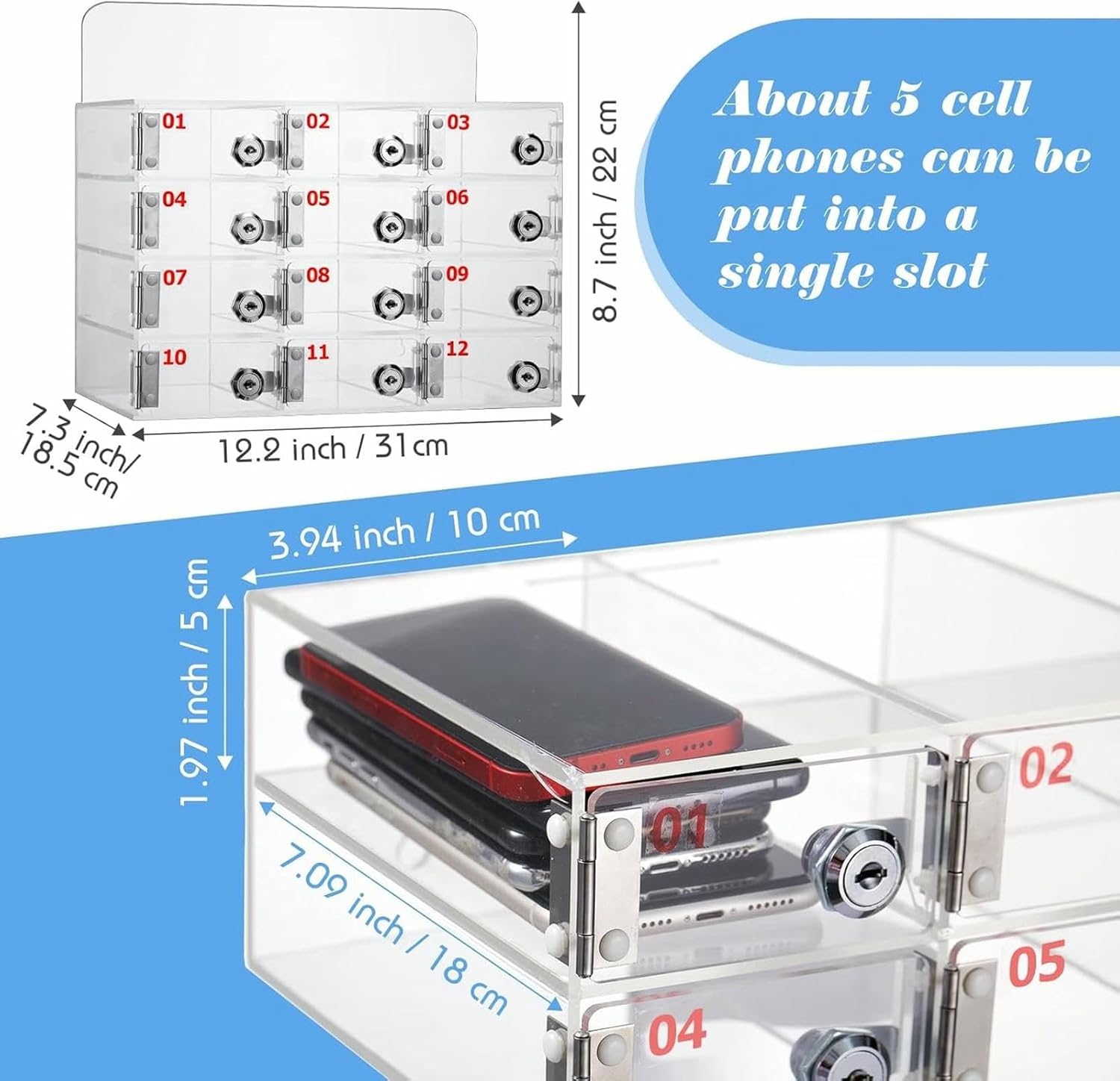Applied to a variety of occasions, it is easy to concentrate, improve learning and office efficiency. It is suitable for storing all types of mobile phones, and each cell is marked with numbers for easier searching. Features: Product Name: Mobile Phone Storage Cabinet with Charging Hole Cabinet Type: Cabinet Material: Acrylic Product Condition: Brand New Style: Modern and simple Opening method: Key type Function: Transparent Size: (optional) 12 grids package size: 39 * 26 * 30cm; weight: 3.4kg 15 grids package size: 39 * 26 * 35cm; weight: 4.1kg 20 grids package size: 50 * 26 * 35cm; weight: 5.2kg 25 grids package size: 60 * 26 * 36cm; weight: 6.5kg 30 grids package size: 60*26*40cm; weight: 7.3kg Applins: schools, offices, gyms, mobile phone shops, conference rooms, military, research rooms, studios or other places. Note 1. Color: Due to various factors such as the brightness of the computer screen or the lighting level, the actual color of the item may be slightly different from the pictures shown on the website. 2. Size: The dimensions are measured by hand, so please allow a slight deviation within 1cm-2cm. 3. Only sell mobile phone safes