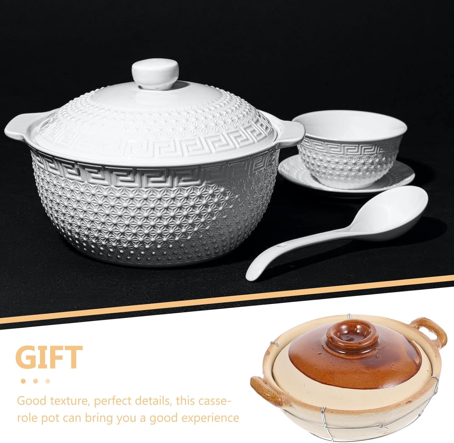 Package Include 1 x Pot Features -Product Info:Double ear casserole -Color:Multi -Material:Granular soil - Size: 27.00X22.00X7.50cm/10.61X8.65X2.95in - There are many uses, such as cooking noodles, soup rice, braised chicken, braised pork, and so on kitchen stockpot. - The casserole has creative outlook and simple design, which is practical for people to use kitchen stew pot. - A good gift for your family and friends who like cooking, and they will like it casserole pot. - Suitable for garden party, food party, family gathering, friends gathering, or just daily life cooking pots. - Non-stick design and smooth surface, easy to clean and operate. The double ears can prevent you from being scalded steam pots for cooking.Goods Informationpots You can enjoy a time.stew pot with lid This pot is a kitchen pot, made of safe material for to use.cookware The product is suitable for people to use.small pots for cooking Perfect for preparing traditional Japanese dishes such as mixed rice, soups and casseroles.cooking pot It is perfect for braised chicken, soup and so on.cooking pots Also, it can be used at outdoor