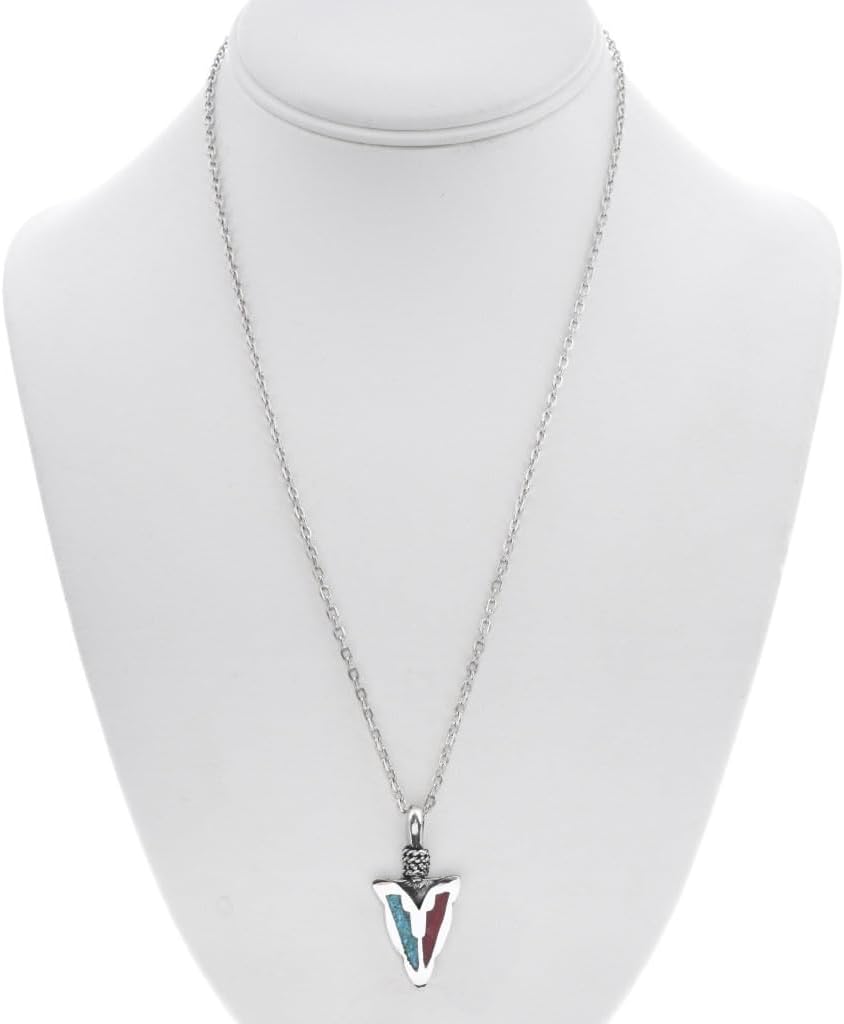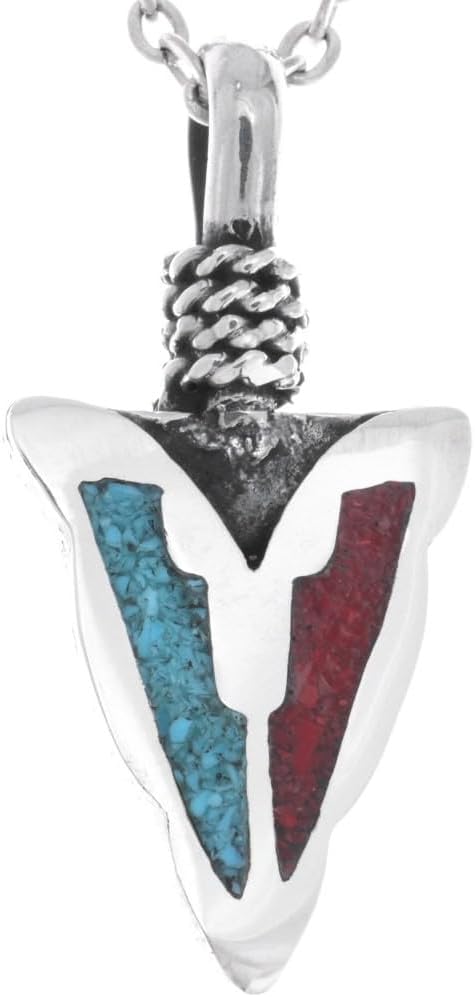 This Navajo Turquoise Coral Inlaid Silver Arrowhead Pendant offers the tribal representation of direction and awareness! This iconic symbol is fitted with genuine Turquoise and Coral chips in Sterling with a twisted wire rope at the top. With the 2.5mm bail included, it's about 1-3/8" long and 3/4" at its widest. It comes with a complimentary silver-plated chain, that you can upgrade to Sterling for an additional fee. From our Native American jewelry shop, it's stamped Sterling and hallmarked. A thoughtful gift for an Arrow of Lights ceremony recipient, this Navajo Turquoise Coral Inlaid Silver Arrowhead Pendant is a nice choice for just about anyone!