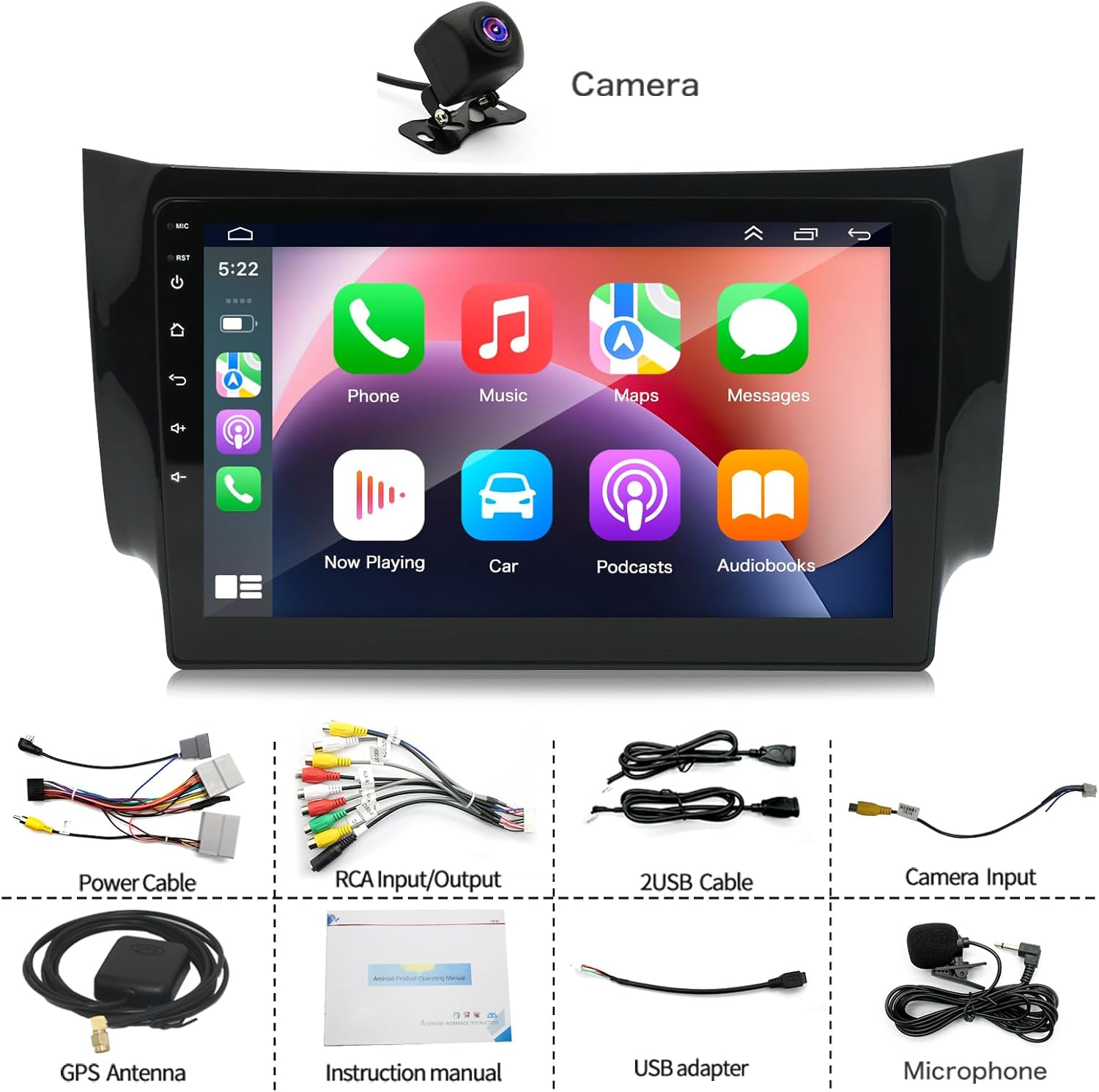 | BuiltIn Media | 1*AHD Backup camera/ 1*Microphone/ 1*Power cable/ 1*Camera input/ 2*USB adapter/ 2*USB cable/ 1*GPS antenna/1* Instruction manual/ 1*Canbus Box/ 1*RCA imput/output/ 1*AUX cable/ 1*AUX patch cord/ 1*Tum the USB connection/ 1*Radio adapter |