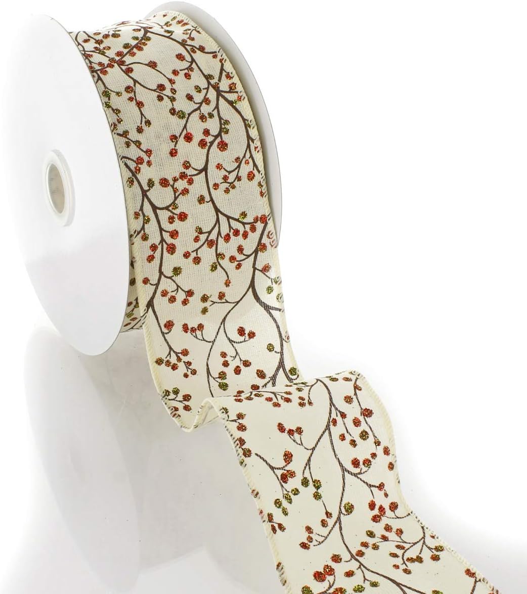 Wired Ribbon | Glitter Berry Branch Get creative with our 2.5" wired craft ribbon!Constructed of an off-white woven fabric ribbon base with a fall color themed glitter berry branch print design. This ribbon would make a beautiful addition to packaging gifts, floral arrangements, and fall decor such as adding to garlands, wreaths, etc.Wired ribbons have a thin monofilament wire along the edges of the ribbon that help the ribbon to be shaped into beautiful loops and bows and hold their desired shape.70% polyester, 30% cotton*25yd reels may be spliced