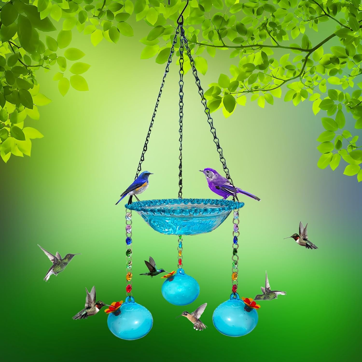 Hanging Birdbath Bird Feeder Multipurpose Innovative Lightweight Large Space Hanging Bird Bath for Outdoor Garden LawnFeature:Perfect Combination: The Solar Bird Bath on Top and the Hummingbird Feeders for Outdoors Hanging Below. These Solar Hummingbird Feeders Are Good Garden Decoration.Hummingbird-Friendly Design: The Hanging Bird Bath is Just the Right Size and Depth for Little Birds. The Gentle Flow from the Water Bubbler Keeps Them Clean and Happy, Encouraging Them to Return to Your Garden Year after Year.Hand-Blown Glass:Each bird feeder ball is expertly crafted by skilled artisans, featuring eye-catching red silicone flowers that not only attract hummingbirds quickly but also protect their tongues from injury.Simple Cleaning & Refilling:Easily hand-wash or place in the dishwasher for a thorough clean. The bird baths and feeder balls are fade-resistant, ensuring longevity and durabilitySpecification:Item Type: Hanging Birdbath Bird FeederMaterial: Plastic, IronSize:23.5*70cm/9.25*27.6inPackage List:1 x Hanging Birdbath Bird Feeder