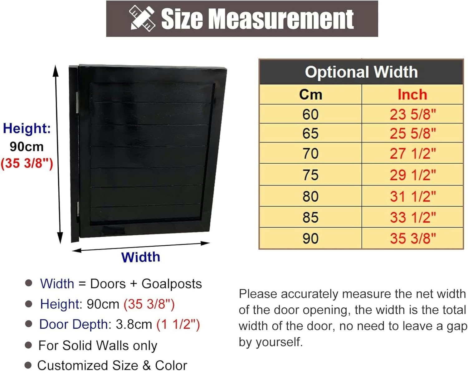 ❁ Our swinging door can be used as a home decor to add a touch of elegance to your life.❁ Package Contents: 1 x Saloon Door1 x Doorpost2 x Hinges (Mounting Hardware Included)❁ Specification:- Material: Solid Wood- Color: Black- Height: 90cm (35 3/8")- Width: Doors + doorpost- Custom Size: Yes- Custom Color: Yes- Process: Handmade, Sanding❁ Feature:- Wooden saloon door gate for long-term use.- Smooth and full surface, no peculiar smell.- Flexible to use, easy installation & cleaning.- Two-way open and automatic rebound.- Decorate your house / divide rooms and spaces.- Customized size and color exclusively for you.- For pubs, living room, balcony, laundry, library, farmhouse.- Suitable for any residential or commercial environments.❁ Please Note:- For the convenience of installation, the size of the door opening should be slightly larger than the total width of the product.- Due to the light and screen difference, the item's color may be slightly different from the pictures.- There may be slightly deviation in dimensions due to manual measurement. Thank you for your understanding.❁ Efficient Customer Service:- In the process of receiving or using the product, if you encounter any problems, please feel free to contact us. We value your comments and offer nice solution for you.