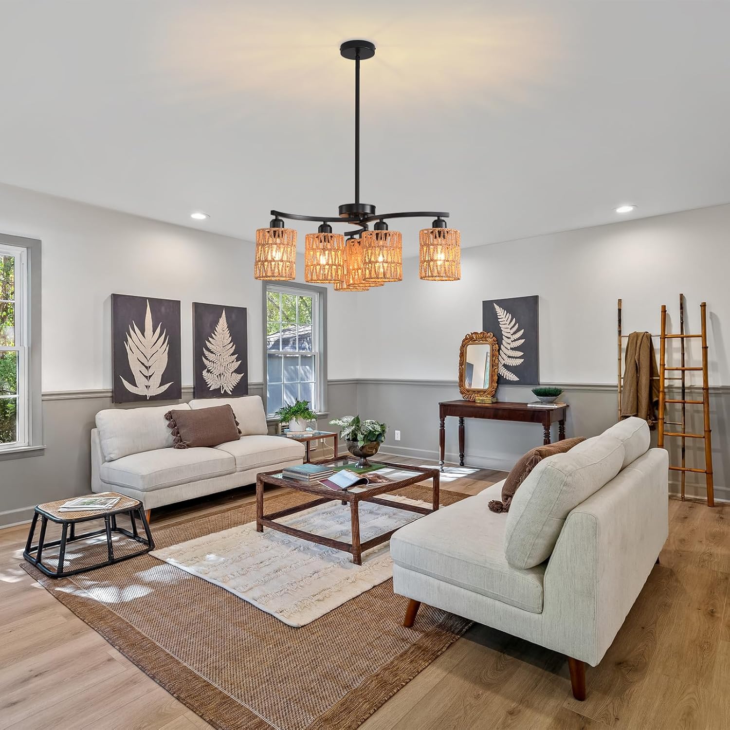 Rattan Farmhouse Chandelier, 6-Light Black Pendant Lights Kitchen Island Lighting, Boho Ceiling Hanging Lamp, Rustic Dining Room Light Fixture for Living Room Bedroom E26
