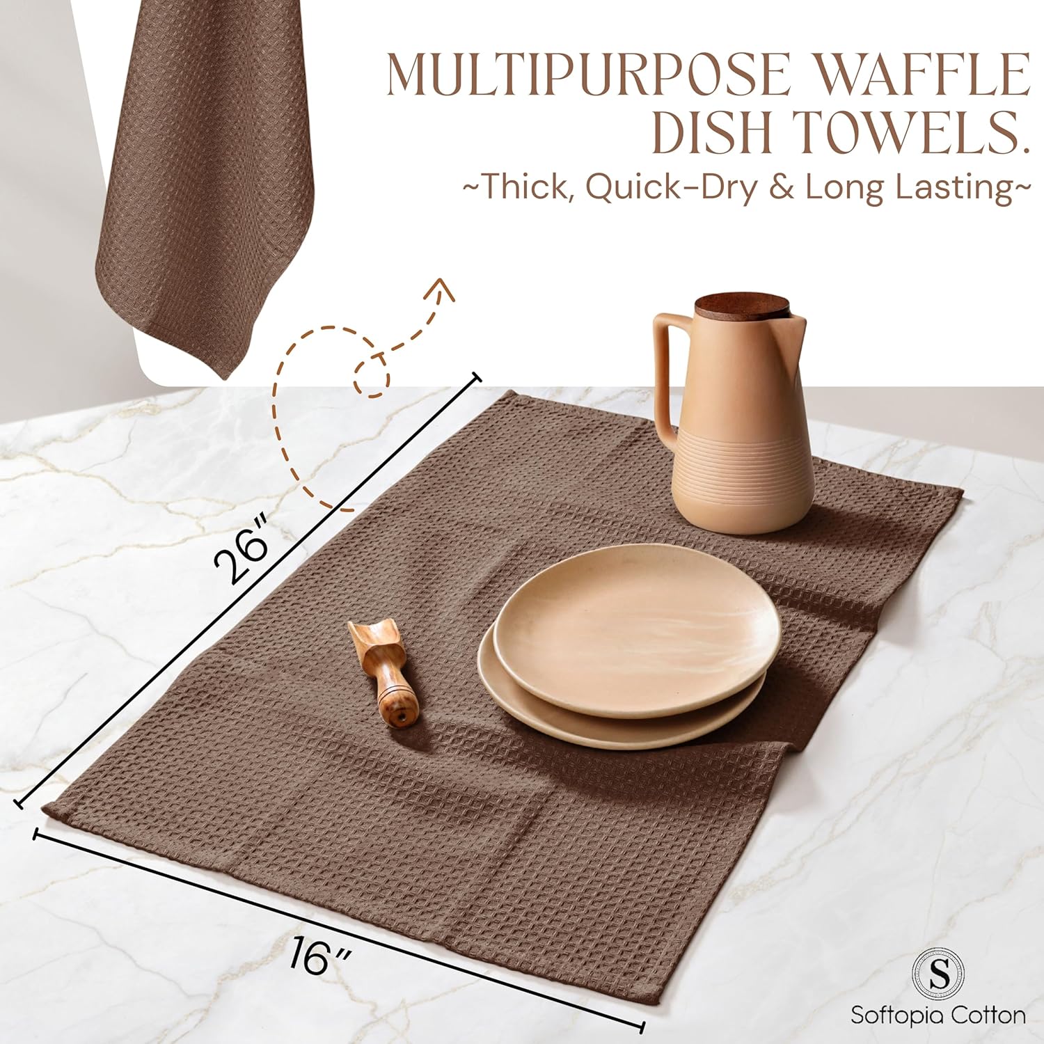 Anyone with a passion for the kitchen knows the invaluable role that kitchen towels play. Kitchens are prone to messes, and having an ample supply of kitchen towels on hand can be a lifesaver when dealing with splatters, spills, and splashes. When choosing kitchen towels, it's not just about their color and appearance; the quality matters significantly. Our Softopia Cotton Waffle Set of 12 Kitchen towels, sized at 16 x 26 inches, is a versatile addition to your kitchen. These towels can be employed in various ways, serving as hand towels, tea towels, cleaning cloths, dish towels, and even finding utility in professional settings like restaurants and bars. They are also ideal for baking tasks and make excellent choices for housewarming and hostess gifts. Moreover, they provide a perfect canvas for creative embroidery work.What sets our premium dish towels apart is their 100% cotton composition, free from any harmful polyester materials. This makes them not only effective but also safe for you and your family. These towels are expertly designed to offer a secure grip while efficiently drying dishes and glasses. They are versatile and perform exceptionally well in various kitchen tasks, from cleaning cutting boards to carrying hot plates and dishes, and handling general household cleaning chores. Crafted from robust and gentle cotton-enriched fabric, our towels are soft and comfortable, ensuring they won't scratch your delicate cookware, plates, or pans. They boast excellent water-absorbing properties, resist fading, remain wrinkle-free, and exhibit a thick and durable texture. These towels are not only sturdy but also reusable and washable numerous times. Thanks to the use of yarn-dyed cotton, the colors remain vibrant and do not bleed even after multiple washes. We recommend washing them separately on the first use to minimize lint and enhance their absorbency.